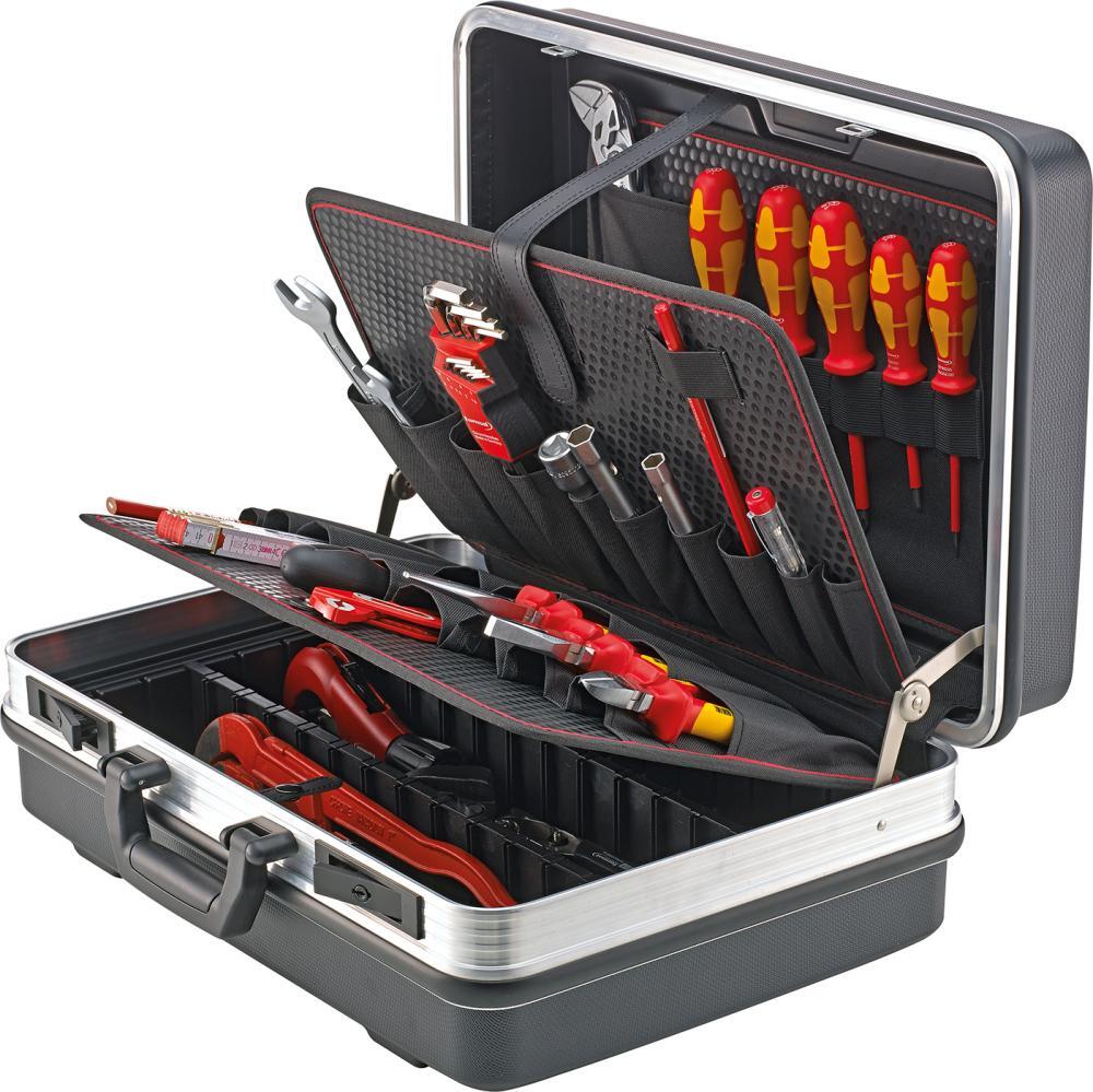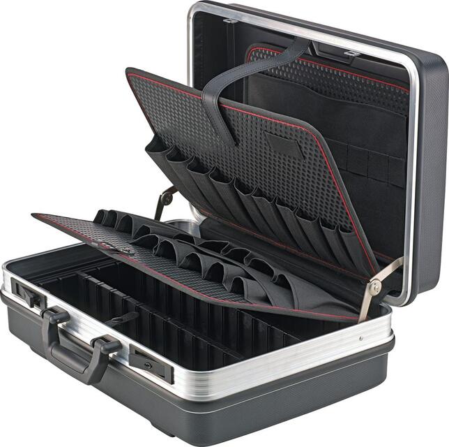 Kufre na náradie Provedenie: Z plastu ABS odolného proti opotrebovaniu, odolného proti vlhkosti, čierneho, s pevným doskami na náradie zo špeciálneho plastu pre odolnosť proti poškriabaniu, tvarovú stabilitu a odolnosť proti vlhkosti, tukom a chemikáliám a so stabilnou rukoväťou. Skořepina dna s výškou 58 mm, voľne rozdeliteľná. S pozinkovanými kovovými kĺbovými pántmi, kufor zaťažiteľný do 15 kg, obvodový rám z hliníka. Veľmi stabilný, s klzmi. Zamykateľný 2 klopnými zámkami. Dodáva sa bez obsahu. Vybavenie: 21 zástrčnými priehradkami na 2strannej doske pre náradie 13 zástrčnými priehradkami na krycej doske 1 skořepinou dna s krycou doskou 1 priehradkou na dokumenty na malej doske na nástroje na veku 7 pútkami na malej doske na nástroje na veku Výrobca: Einkaufsbüro Deutscher Eisenhändler GmbH, EDE Platz 1, 42389 Wuppertal, DE, +4920260960, webkontakt@ede.de