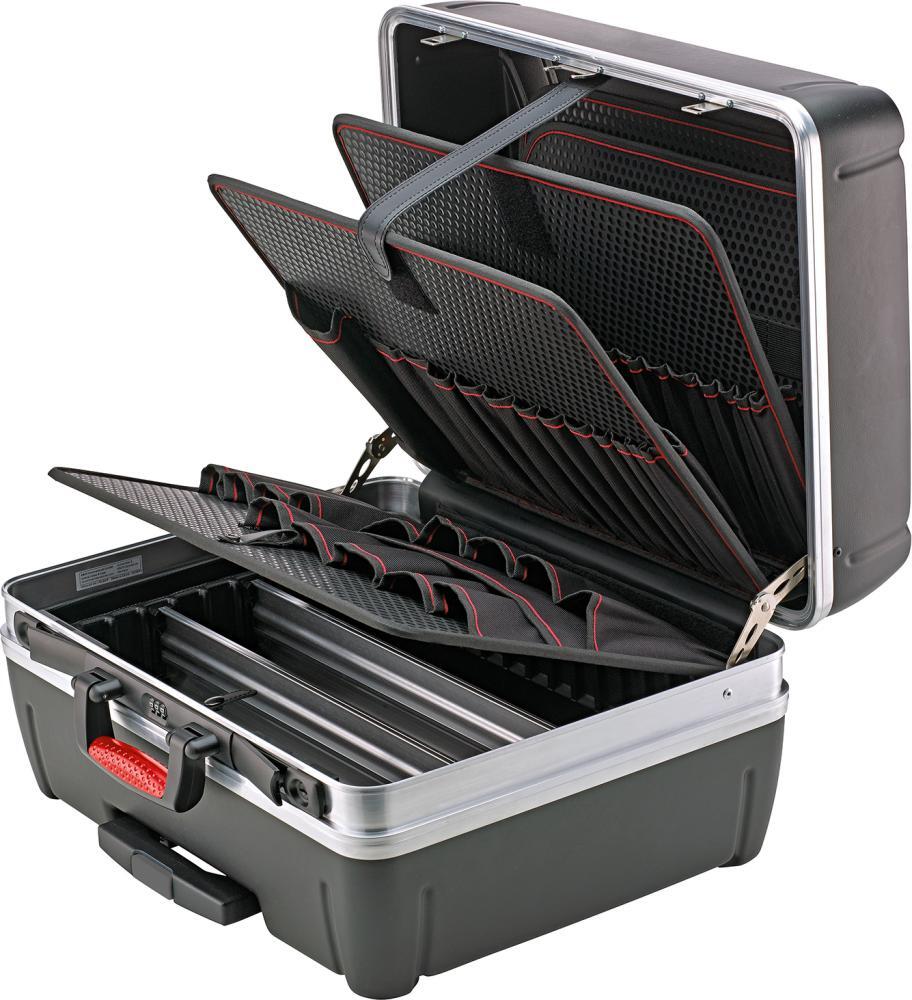 Kufor na náradie s kolieskami Vyhotovenie: Z extrémne odolného plastu HDPE proti opotrebovaniu, čierneho, s pevným plášťom zo špeciálneho plastu pre odolnosť proti poškriabaniu, tvarovú stabilitu a odolnosť proti vlhkosti, tukom a chemikáliám a so stabilným, práškovou farbou lakovaným trojnásobným teleskopickým výsuvom a kolieskami s ľahkým chodom. Škrupina dna s výškou 88 mm, voľne rozdeliteľná. S robustnými, stabilnými pántmi, bezpečnostným držiakom veka, kufor zaťažiteľný až do 35 kg, dvojitý rám z hliníka s ochranou proti nárazu. Veľmi stabilný a s ochrannými, integrovanými klzákmi. Zamykanie na 2 klopné cylindrické zámky a 1 kódový zámok. Dodáva sa bez obsahu. Vybavenie: 23 zasúvacích priehradiek na obojstrannej doske pre náradie 23 zasúvacích priehradiek na obojstrannej doske pre náradie 14 zasúvacích priehradiek na krycej doske 1 veľká zasúvacia priehradka na krycej doske 1 škrupina dna s krycou doskou 7 pútok na paneli veka 1 priehradka na dokumenty v paneli veka Výrobca: Einkaufsbüro Deutscher Eisenhändler GmbH, EDE Platz 1, 42389 Wuppertal, DE, +4920260960, webkontakt@ede.de
