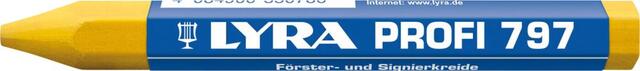 Lesnícka a značkovacia krieda Provedenie: Šesťhranná a obalená papierom. Dodávka v kartóne à 12 kusov. Použitie: K popisu všetkých druhov dreva, suchého alebo mokrého, extrémne vysoká miera pigmentácie, najlepšie suroviny, etikettované proti znečisteným prstom, vysoká odolnosť proti lomu. Výrobca: Johann Froescheis Lyra-Bleistift-Fabrik, Willstätterstr. 54-56, 90449 Nürnberg, DE, +4991168050, info@lyra.de