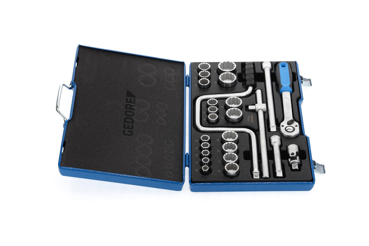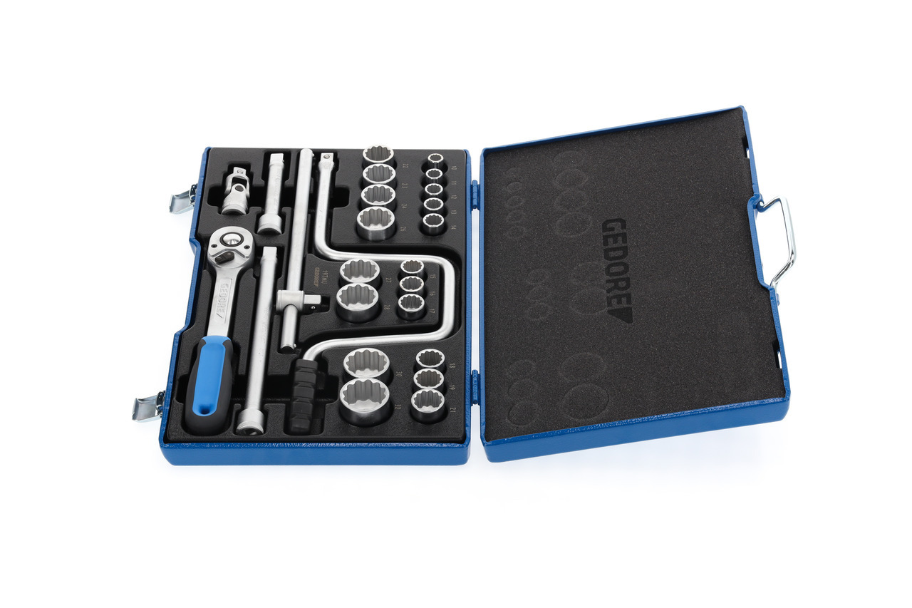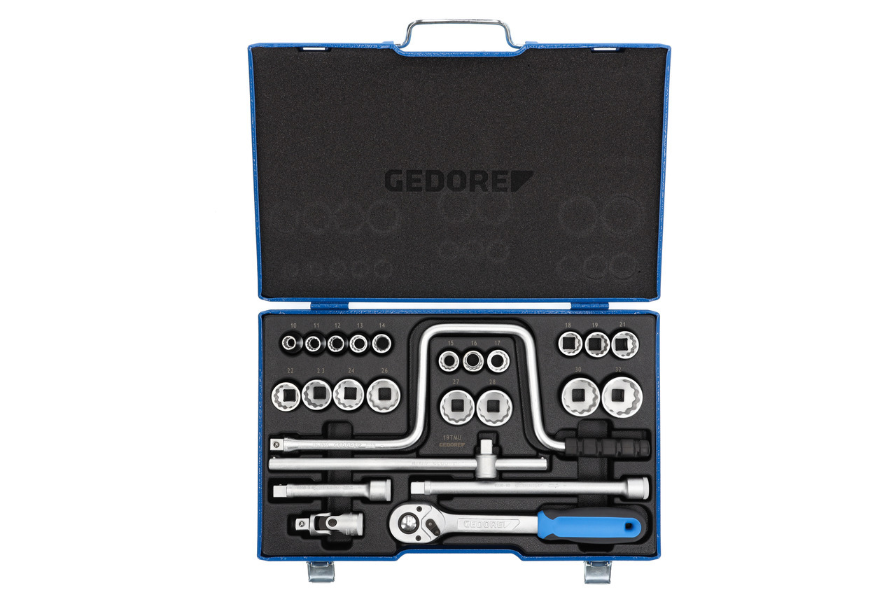 Z kutým, vylepšeným teplom, obsluhovaným ručne šesťuholníkovým profilom UD (č. 19) alebo 12-bodovým profilom UD (č. D 19) Vložky do kľúčov s nástrčnými hlavicami, S náradím na skrutkovanie z vanádiovej ocele GEDORE 31CrV3, S pevným obojstranným ráčnovým mechanizmom s uvoľnením tlačidlom, V plechovej modrej kazete GEDORE, Rozmery: 425 x 277 x 55 mm