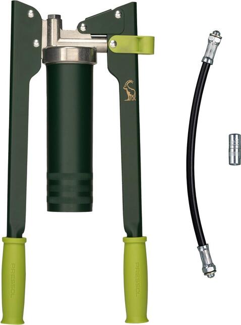 Ručný mazací lis easyFILL Vyhotovenie: Podobne ako podľa DIN 1283. Z pozinkovanej ocele, pre náročné použitie, hrúbka steny 1 mm. Čerpacie piesty s vysokou presnosťou lícovania k valcu (žiadne zdánlivé mazanie). Vhodný pre 400g tukovú kartušu podľa DIN 1284. Spracováva tuky do NLGI 3 až 10 °C. Dodáva sa s pancierovou hadicou s tesnením M10 x 1, 11 x 300 mm, presnou hubicou, 4 BA, M10 x 1 a 10 mazacími vlečnými piestami, držiakom hadice a magnetom. Použitie: Úplne sa zaobíde bez pružinového mechanizmu. Jednoducho vložte náplň, nasaďte mazací vlečný piest a začnite. Vďaka vakuu v hlave mazacieho lisu sa piest pohybuje nahor úplne sám. Vďaka variabilnému systému Stroke je možné mazací lis ľahko ovládať aj pomocou minimálneho pohybu páky. Výrobca: Pressol Schmiergeräte GmbH, Tiergartenstraße 5, 79423 Heitersheim, DE, +4976659346000, service@pressol.com