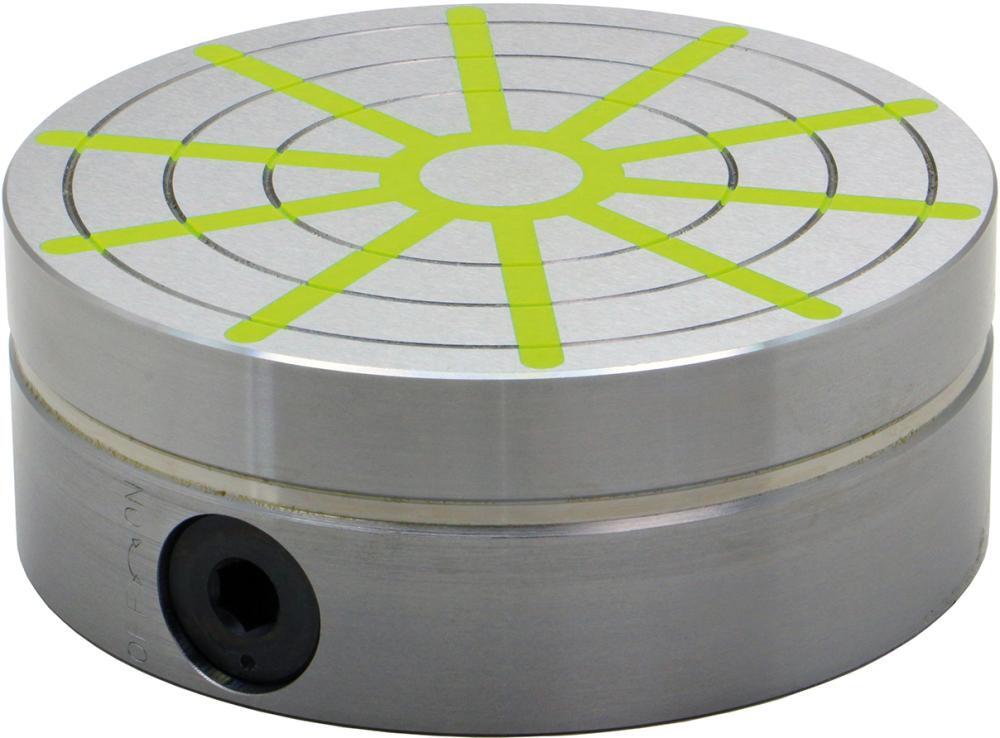 Magnetické kruhové sklíčidlo RS s permanentným magnetom Provedenie: Systém neodymových magnetov s radiálnou a hviezdicovou roztečou pólov. Magnetickú silu je možné plynule regulovať. Koncentrické drážky uľahčujú vyrovnanie obrobku. Doprostred dosky je možné vyvŕtať priechodný otvor (Ø C). Priedržná sila: cca 140 N/cm² Výška magnetického poľa: cca 10 mm Opotrebovateľnosť pólovej dosky: 3 mm pri Ø 130 mm, 7 mm od Ø 150 mm Použitie: Extrémne silné kruhové sklíčidlo, koncipované predovšetkým na obrábanie prstencov a obrábanie na tvrdo pri vysokých otáčkach. Upozornenie: Hĺbky vŕtania pólovej dosky u nových, nedobrobených alebo neobrábaných radiálnych pólových sklíčidiel: do Ø 400 mm = 16 mm, od Ø 500–600 = 26 mm. Výrobca: Flaig Magnetsysteme GmbH & Co. KG, Feurenmoos 15, 78739 Hardt, DE, +497422940010, info@flaig-te.de