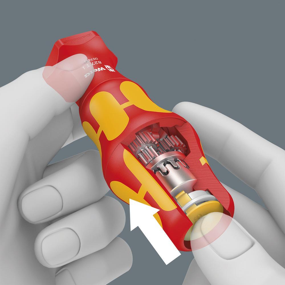 Ručný držák VDE Turbo pre výmenné čepele Vyhotovenie: Dvojsložková plastová rukoväť s integrovanými mäkkými zónami pre lepšie uchopenie a ochranu proti odkutáleniu. Pripojiteľná planetová prevodovka z ocele integrovaná v rukoväti zvyšuje pracovnú rýchlosť. Turbo znásobuje rýchlosť skrutkovania, čisto mechanicky, maximálny krútiaci moment 14 N·m. Odpojenie sa odporúča pre jemné ladenie a záverečné dotiahnutie skrutky. Izolované do 1000 V podľa IEC 60900, DIN EN 60900. Použitie: Pre upnutie výmenných čepelí Wera VDE. Výrobca: Wera Werkzeuge GmbH, Korzerter Str. 21-25, 42349 Wuppertal, DE, +4920240450, sales@wera.de