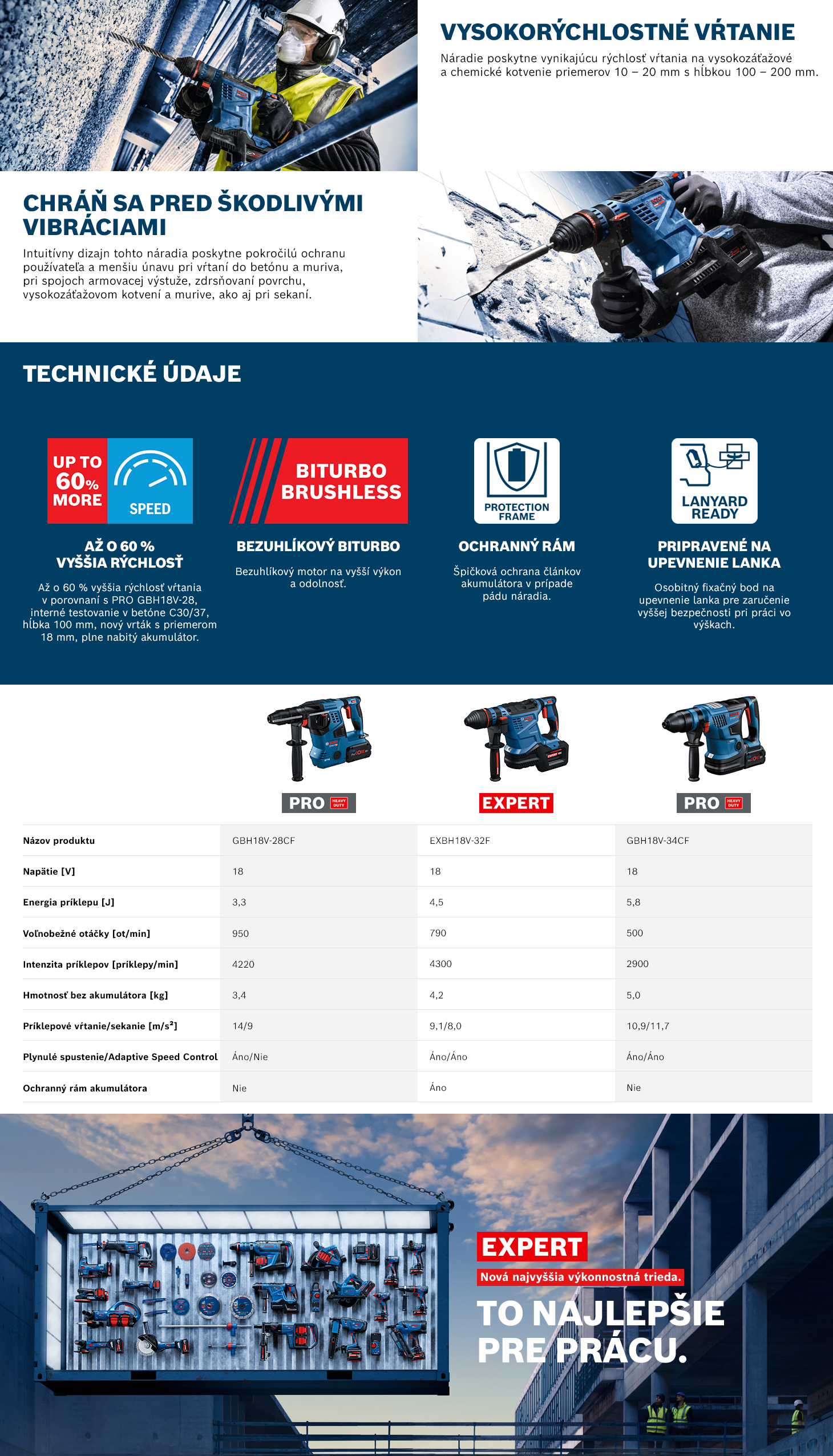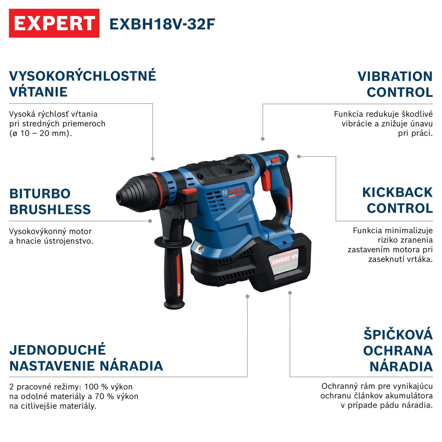 EXPERT EXBH18V-32F je robustné a vysokootáčkové vŕtacie kladivo SDS plus na vŕtanie veľkých a hlbokých otvorov. Zvyšuje efektivitu práce vďaka až o 60 % vyššej rýchlosti vŕtania otvorov stredných priemerov (⌀10 – 20 mm; v porovnaní s Professional GBH 18V-28). Všetko vďaka technológii BITURBO BRUSHLESS vysokovýkonným motorom a hnacím ústrojenstvom, ktoré sú špeciálne navrhnuté na skvelé využívanie extrémneho výkonu akumulátorov EXPERT. Vysokoefektívny pohon zvyšuje produktivitu a umožňuje vytvoriť výrazne viac pevných ukotvení na jedno nabitie akumulátora. Vŕtacie kladivo SDS plus má zvýšenú ochranu: Funkcia Vibration Control redukuje škodlivé vibrácie a uľahčuje prácu, funkcia KickBack Control minimalizuje riziko zranenia zastavením motora pri zaseknutí vrtáka. EXPERT EXBH18V-32F má tiež vynikajúcu ochranu náradia a extrémne odolný rám akumulátora, ktorý dokonale ochráni články akumulátora v prípade pádu náradia. Náradie má jednoduché nastavenia a je vybavené dvomi ľahko použiteľnými režimami: 100 % výkon na odolné a 70 % výkon na citlivejšie materiály.