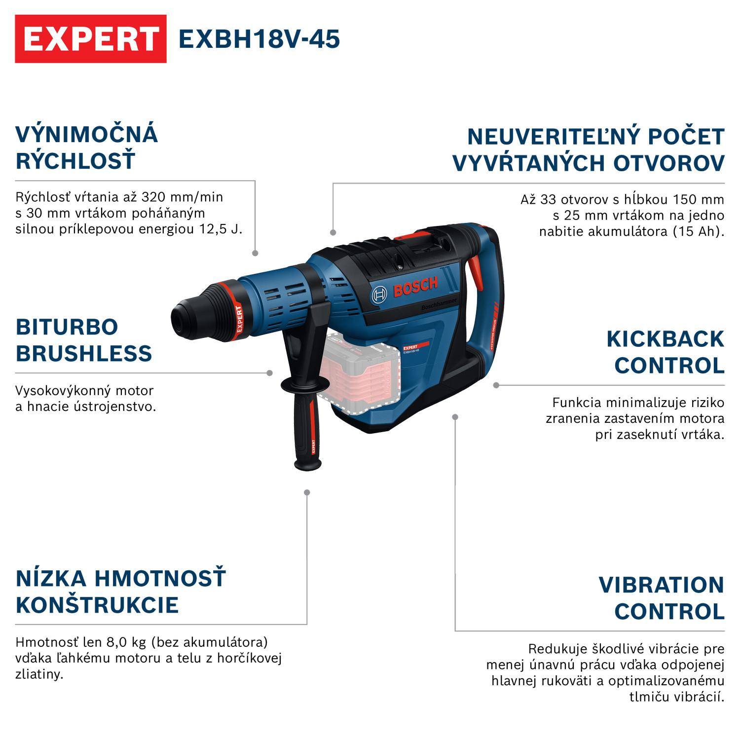 Vŕtacie kladivo EXPERT EXBH18V-45 SDS max prinesie do vašej práce výnimočnú rýchlosť – Až 2× vyššia rýchlosť vŕtania v porovnaní s Professional GBH 18V-36 C*. Skvelú výkonnosť s rázovou energiou 12,5 J zabezpečuje technológia BITURBO Brushless, vysokovýkonný motor a hnacie ústrojenstvo špeciálne navrhnuté na skvelé využívanie extrémneho výkonu akumulátorov EXPERT. Na jedno nabitie akumulátora náradia EXPERT EXBA18V-150 vyvŕtate s 25 mm vrtákom neskutočné množstvo až 33 otvorov s hĺbkou 150 mm. Navyše ide o najľahšie náradie vo svojej triede s hmotnosťou iba 8 kg (bez akumulátora) – to všetko vďaka ľahkému motoru a telu z horčíkovej zliatiny.