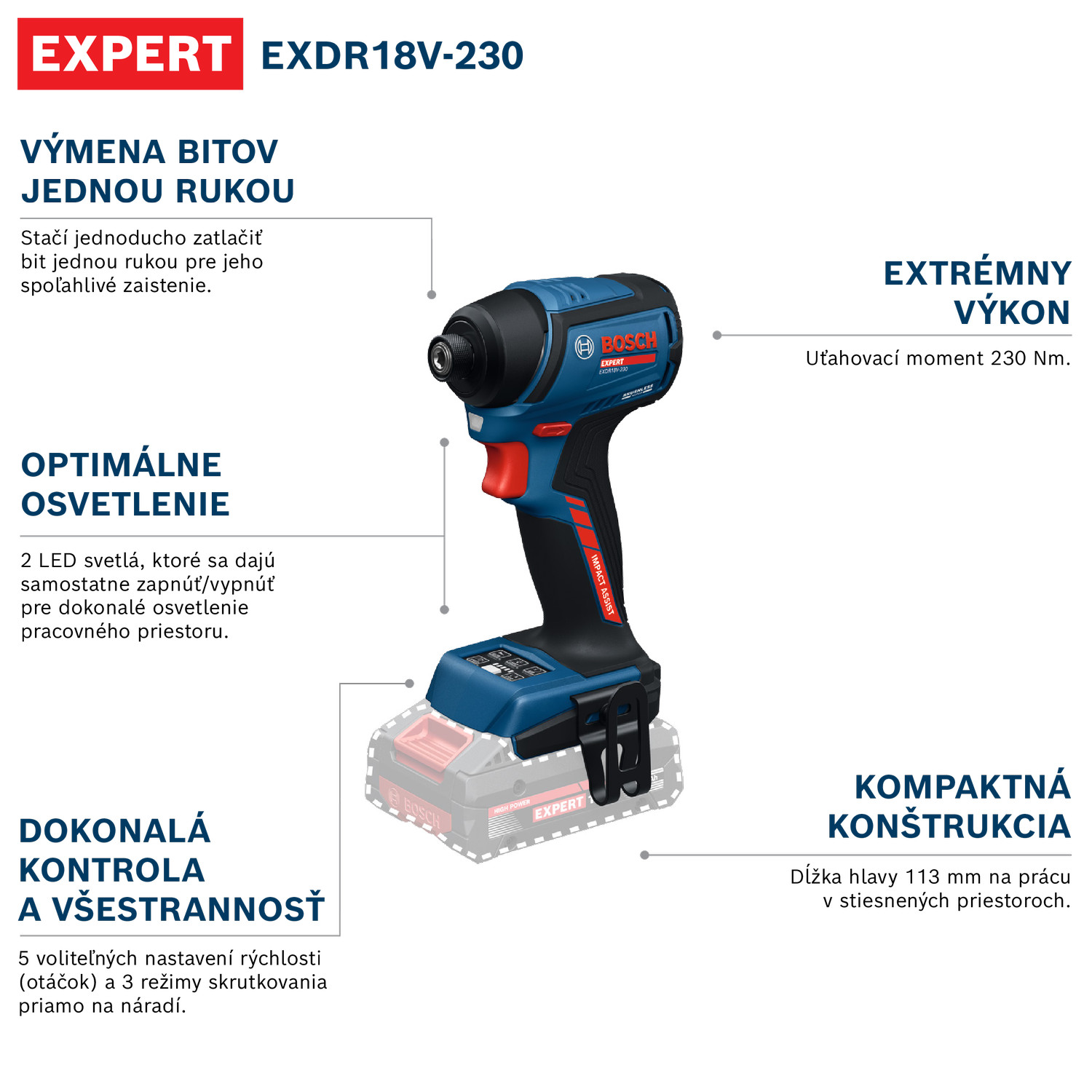 Rázový skrutkovač EXPERT EXDR18V-230 kombinuje výkon s výborným ovládaním. Vďaka vysokovýkonnému bezuhlíkovému motoru s až 3400 ot/min, uťahovacím momentom 230 Nm a piatimi nastaveniami rýchlosti zvládnete prácu rýchlejšie a s optimálnou kontrolou náradia. Tri nastaviteľné režimy skrutkovania automaticky spomalia alebo vypnú náradie. Tým pomáhajú predchádzať zlomeným hlaviciam skrutiek a poškodeniam obrobkov pri chode náradia v smere hodinových ručičiek, a zabránia pádu matíc/skrutiek pri chode náradia proti smeru hodinových ručičiek. Na vkladanie skrutkovacích bitov je potrebná iba jedna ruka – bit jednoducho vtlačte na jeho spoľahlivé zaistenie. Vďaka dvom LED svetlám, ktoré sa dajú samostatne zapnúť/vypnúť, získate najlepšie osvetlenie pracovného priestoru vo svojej triede.