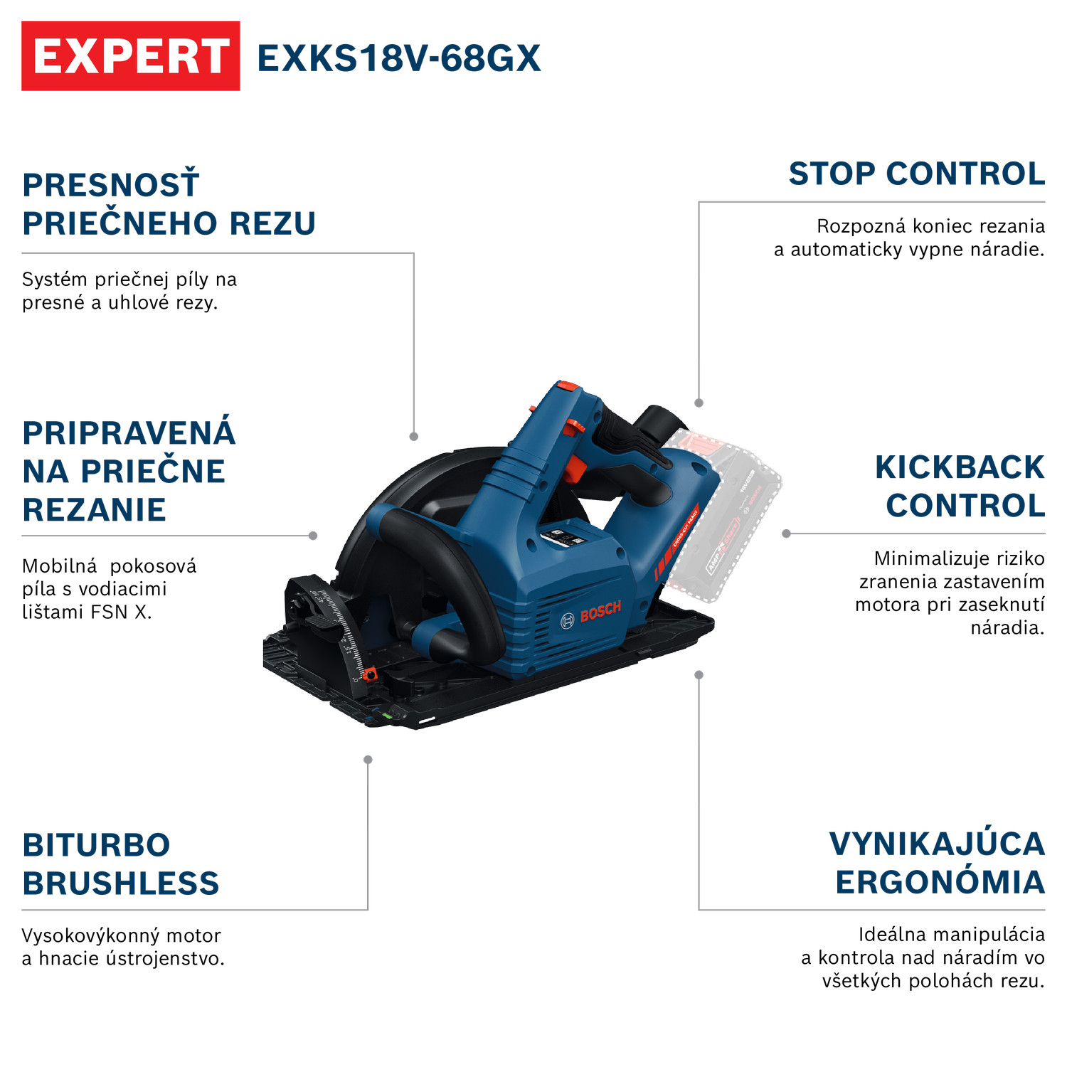 EXPERT EXKS18V-68 GX je špičková 18 V okružná píla s presným priečnym rezaním. V kombinácii s vodiacimi koľajničkami FSN X vytvorí vynikajúci mobilný systém kapovacej a pokosovej píly na presné a uhlové rezanie. Je vybavená výkonnou technológiou BITURBO Brushless, vysokovýkonným motorom a hnacím ústrojenstvom, ktoré sú špeciálne navrhnuté na skvelé využívanie extrémneho výkonu akumulátorov EXPERT. EXPERT EXKS18V-68 GX je pripravená na priečne rezanie a v kombinácii s vodiacimi koľajničkami Bosch FSN X sa náradie premení na špičkovú mobilnú kapovaciu a pokosovú pílu. Táto okružná píla je vybavená pokročilou ochranou: Funkcia Stop Control rozpozná koniec rezu a okamžite vypne náradie, funkcia KickBack Control zasa zastaví motor, keď sa náradie zasekne. Obe tieto funkcie minimalizujú riziko zranenia. Skvelá ergonómia náradia umožňuje dokonalú manipuláciu a ovládanie vo všetkých polohách rezania.