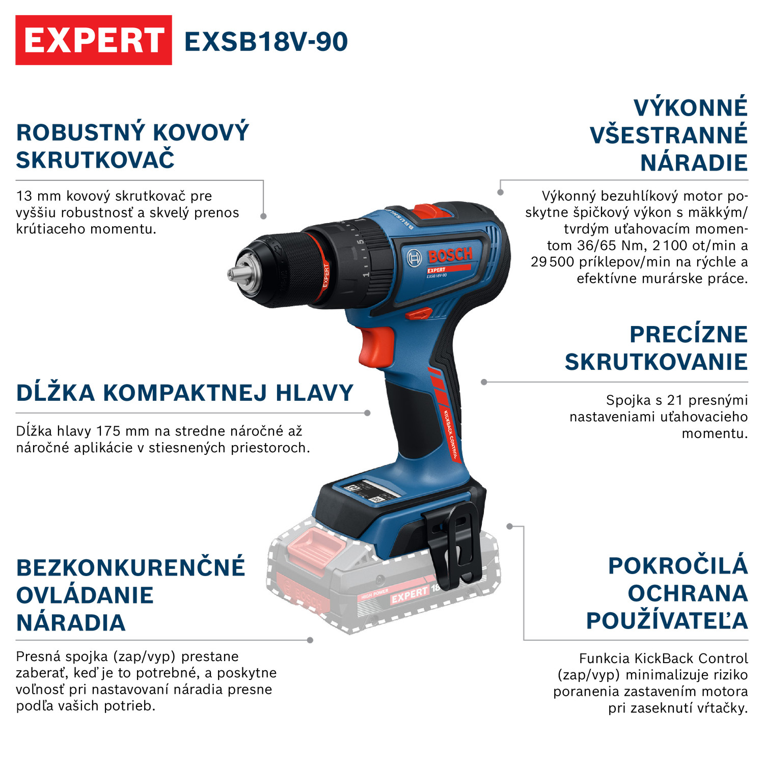 EXPERT EXSB18V-90 je výkonný akumulátorový príklepový vŕtací skrutkovač. Toto špičkové všestranné náradie s bezuhlíkovým motorom poskytne špičkový výkon s mäkkým uťahovacím momentom 36 Nm a tvrdým uťahovacím momentom 56 Nm, 2 100 ot/min a 29 500 príklepov/min na rýchle a efektívne murárske práce. Tento kompaktný silák má dĺžku hlavy 175 mm s 13 mm kovovým skľučovadlom na vyššiu robustnosť a skvelý prenos momentu. Má pokročilú ochranu používateľa: Funkcia KickBack Control minimalizuje riziko zranenia zastavením motora pri zaseknutí vrtáka. Túto funkciu je možné zapnúť a vypnúť. Presná spojka zabezpečí maximálnu kontrolu náradia, prestane zaberať, keď je to potrebné, a poskytne voľnosť pri nastavovaní náradia presne podľa vašich potrieb. Redukuje sa tiež opotrebovanie spojky a z toho vyplývajúca hlučnosť.