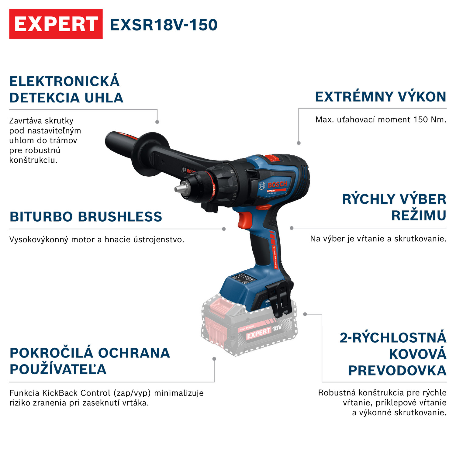 EXPERT EXSR18V-150 je špičkový vŕtací skrutkovač s bezkonkurenčným výkonom a ovládaním pre široký rozsah skrutkovacích a vŕtacích prác. Je vynikajúcim náradím na výrazne rýchlu prácu vďaka bezuhlíkovému motoru s technológiou BITURBO, mimoriadne výkonným akumulátorom EXPERT a maximálnemu krútiacemu momentu 150 Nm. Funkcia KickBack Control minimalizuje riziko zranenia pri zaseknutí vrtáka – túto funkciu je možné zapnúť a vypnúť. Presná elektronická detekcia uhla zaistí správny uhol dlhých skrutiek. Vďaka 13 mm kovovému skľučovadlu a kovovej prevodovke je vŕtací skrutkovač extrémne spoľahlivý a robustný. Má aj prídavnú rukoväť, ktorá sa bez námahy nastaví v každej polohe. Rýchly výber režimu umožňuje jednoduché prepínanie medzi vŕtaním a skrutkovaním.