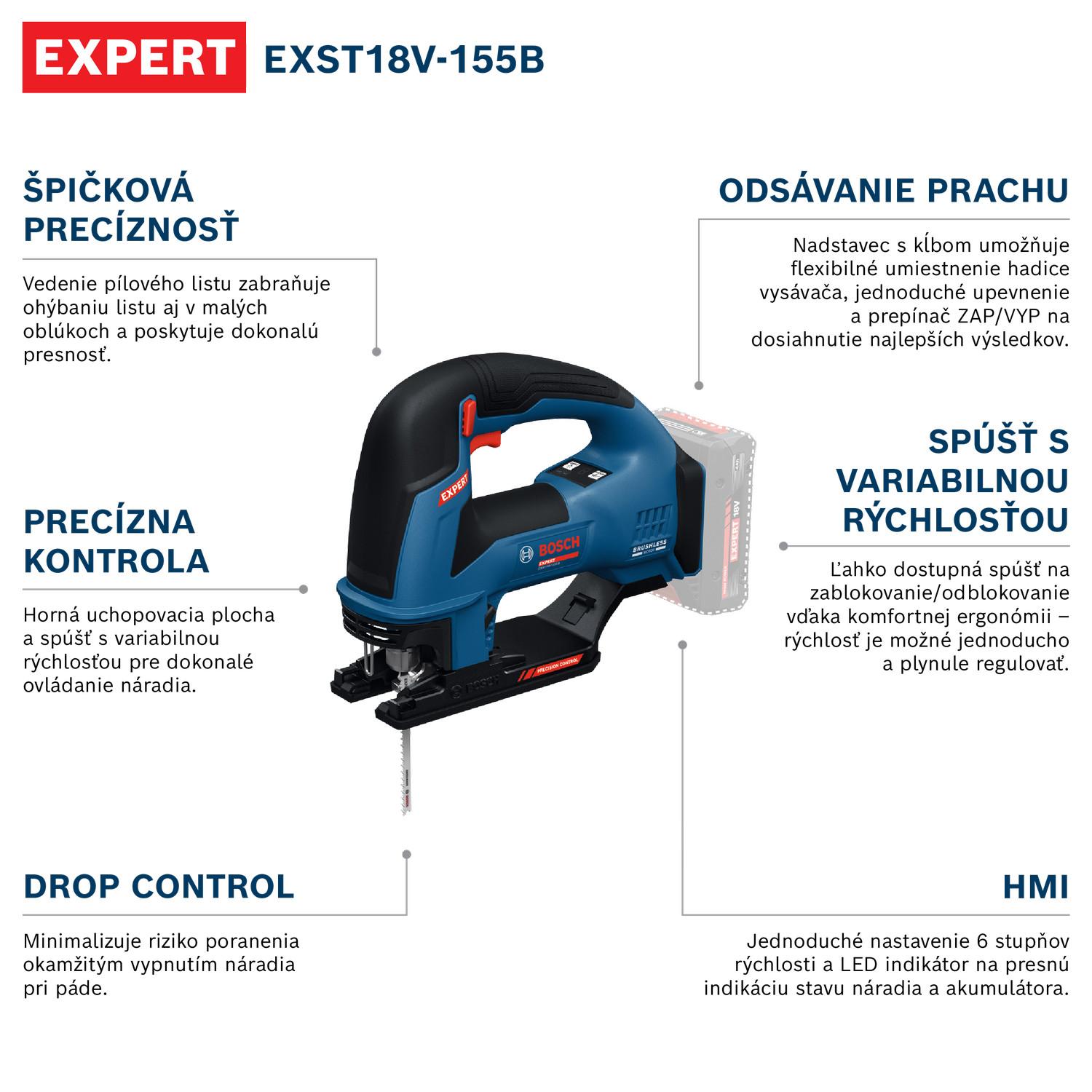 18 V priamočiara píla EXPERT EXST18V-155B s valcovou rukoväťou zabezpečí vynikajúcu precíznosť. Vodidlo pílového listu zabraňuje ohýbaniu pílového listu aj v malých oblúkoch a poskytuje dokonalú precíznosť. Intuitívny ergonomický dizajn s hornou uchopovacou plochou a spúšťou s variabilnou rýchlosťou umožňuje dokonalé ovládanie náradia a zabezpečí vynikajúcu precíznosť rezu. Priamočiara píla má pokročilú ochranu používateľa: Funkcia Drop Control minimalizuje riziko zranenia tým, že pri páde sa náradie okamžite vypne. Zabezpečí spoľahlivé odsávanie prachu s ľahko upevniteľnými adaptérmi s kĺbom na flexibilné umiestnenie hadice vysávača a praktickým vypínačom ZAP/VYP na najlepšie pracovné výsledky. Vďaka komfortnej ergonómii je spúšť s variabilnou rýchlosťou na zablokovanie a odblokovanie na dosah prsta a slúži tiež na pohodlné a plynulé nastavenie rýchlosti. Používateľské rozhranie HMI náradia slúži na jednoduché nastavenie 6 stupňov rýchlosti, LED indikátor poskytne presnú indikáciu stavu náradia a akumulátora