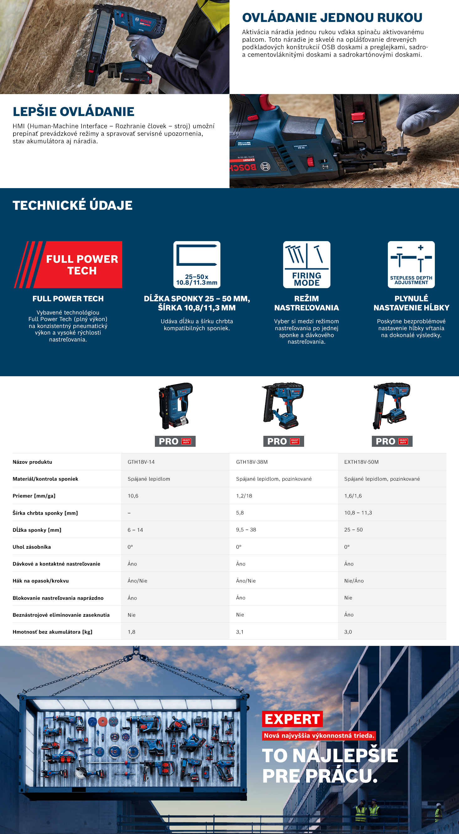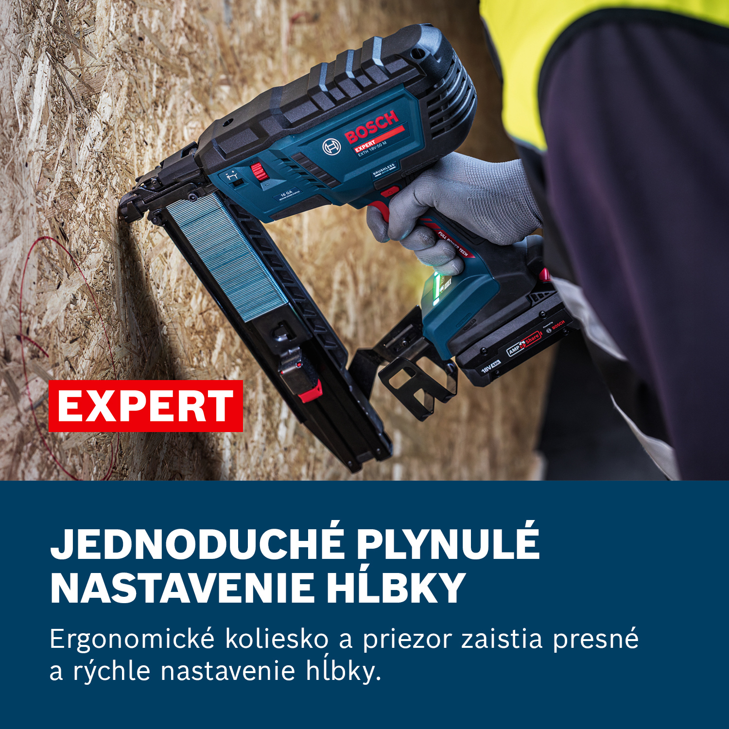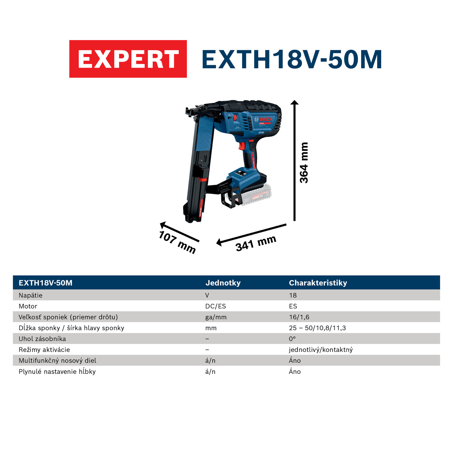 EXPERT EXTH18V-50M je špičkové akumulátorové náradie, ktoré poskytuje výkon zodpovedajúci pneumatickému náradiu, avšak bez problémov s kompresormi, hadicami a plynovými kartušami. Prvá akumulátorová sponkovačka 16ga so strednou šírkou chrbta na svete poskytne akumulátorovú slobodu s pneumatickým výkonom. Bezplynová technológia zotrvačníka je šetrná k zápästiu vďaka nízkej energii spätného rázu. Zároveň eliminuje potrebu používať drahé plynové kartuše a vystavovanie sa škodlivým výparom. Ergonomické koliesko a priezor umožnia jednoduché bezkrokové nastavenie hĺbky na presné a rýchle nastavenie. Dvojfunkčná nosová časť zabraňuje poškodeniu pri montáži sadrokartónu a môže sa reverzne otočiť na dokonalé uchopenie pri montáži opláštenia z OSB dosiek. EXPERT EXTH18V-50M je možné aktivovať jednou rukou vďaka vypínaču aktivovanému palcom.