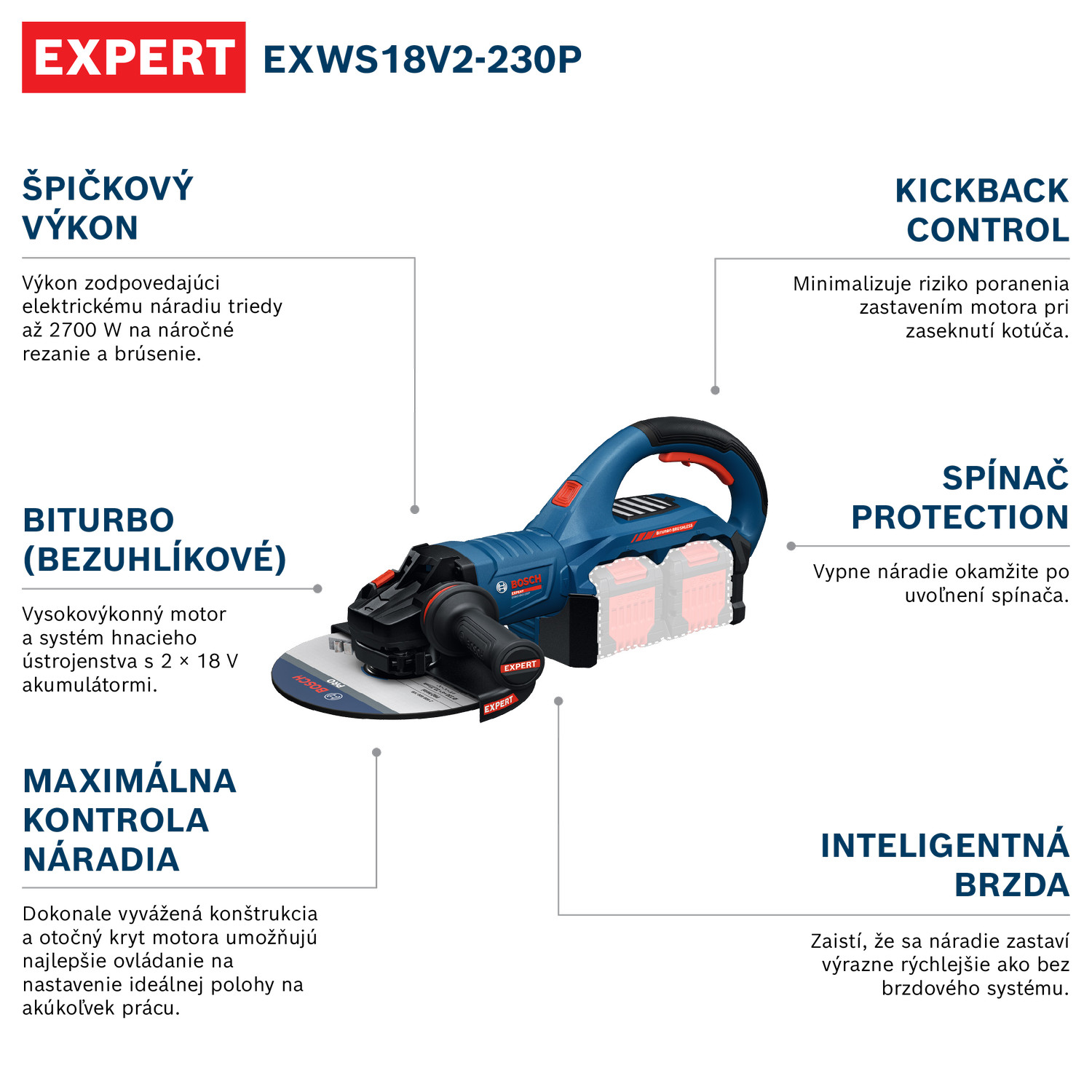 Veľká uhlová brúska EXPERT EXWS18V2-230P s bezuhlíkovým motorom a 2× 18 V akumulátormi poskytne výkon zodpovedajúci elektrickému náradiu triedy až 2700 W na rýchlu a efektívnu prácu. Technológia BITURBO Brushless a 2× 18 V akumulátory, vysokovýkonný motor a hnacie ústrojenstvo sú špeciálne navrhnuté na skvelé využívanie extrémneho výkonu akumulátorov EXPERT. Otočný kryt motora umožňuje nastaviť ideálnu polohu na akúkoľvek činnosť rezania či brúsenia. Dokonale vyvážená konštrukcia a ideálne ťažisko navyše umožnia vynikajúce ovládanie náradia v každej situácii. EXPERT EXWS18V2-230P má pokročilú ochranu používateľa: Funkcia KickBack Control minimalizuje riziko zranenia pri zaseknutí kotúča. Spínač PROtection po uvoľnení náradie okamžite vypne a funkcia inteligentnej brzdy zaistí, že sa náradie zastaví podstatne rýchlejšie ako bez brzdového systému.