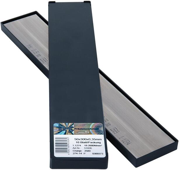 Kovová fólia, oceľ Provedenie: Kovové fólie s tolerovanou odchýlkou hrúbky T3 z pásovej pružnej ocele. Použitie: Pre nastavovanie náradia a foriem, nastavovanie prístrojov a aparátov, vyrovnávanie tolerovaných odchýlok, podkladanie zariadení, vyrovnávanie strojov, nastavovanie vôlí ložísk atď. Upozornenie: Materiál podľa normy DIN 17222 (nová: DIN EN 10 132-4), schválenie pre pružiny. Uhlíková oceľ, kalená pružinová pásová oceľ 1.1274, magnetická. Pre diely s vysokým stupňom opotrebenia kvôli obsahu uhlíka o viac ako 1 %. Pre spárové meradlá v pásoch, podložné fólie, pružiny bez nároku na ochranu proti korózii. Výrobca: H+S Präzisionsfolien GmbH, Am Forst 10, 92648 Vohenstrauß, DE, +499614018030, info@hs-folien.de