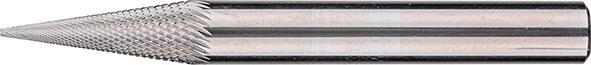 Technická fréza (rotačná fréza) DIN 8032, ozubenie MICRO Použitie: Predovšetkým na jemné opracovanie s vyšším úberom a kvalitou povrchu v oblastiach, kde sa väčšinou používajú brúsne telieska, ako napr. pri veľmi jemných čistiacich prácach, korekciách pri konštrukcii nástrojov a foriem a ostrení rezacích nástrojov. Vhodné na obrábanie ocele, liatiny, nerezovej ocele a tiež tvrdého neželezného kovu a tepelne odolného kovu až do tvrdosti 68 HRC. Kuželový tvar s hrotom SKM. Výrobca: August Rüggeberg GmbH & Co. KG, Hauptstr. 13, 51709 Marienheide, DE, +49226490, pferd@rueggeberg.com