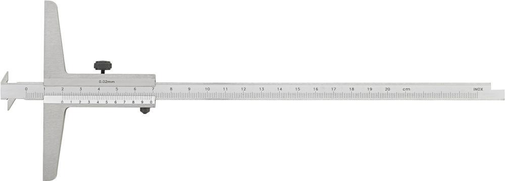 Posuvný hĺbkomer so zníženou obojstrannou mierkou, rozlíšenie 0,02 mm Vyhotovenie: Z nehrdzavejúcej ocele, kalené, stupnica a nonius matne chrómované a obojstranne vysoko presne laserovo označené, s obojstranne zníženou meracou lištou na prestavenie a aretačným skrutkou. Výrobca: Einkaufsbüro Deutscher Eisenhändler GmbH, EDE Platz 1, 42389 Wuppertal, DE, +4920260960, webkontakt@ede.de