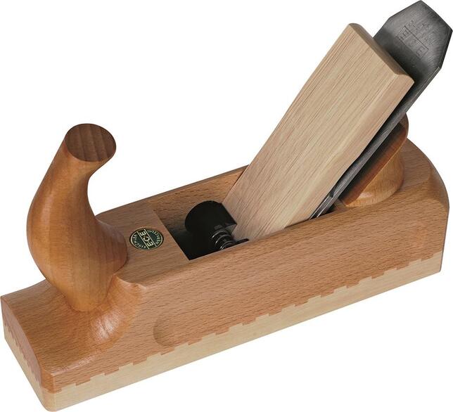 Dvojitý hoblík Provedenie: Z pařeného bukového dreva, lakovaného, so silným prilepeným habrovým spodkom. S ochranou ruky, úderným gombíkom a hoblíkovým nožom, pripraveným na použitie. Integrované oporné ložisko klinu zabraňuje štiepeniu tela hoblíka aj pri najsilnejšom zaklínění. S rezným uhlom 45° na srovnanie a uhladenie predbežne upravených plôch. Výrobca: E.C. Emmerich GmbH & Co. KG, Herder Str.7, 42853 Remscheid, DE, +49219180790, ece@ecemmerich.de