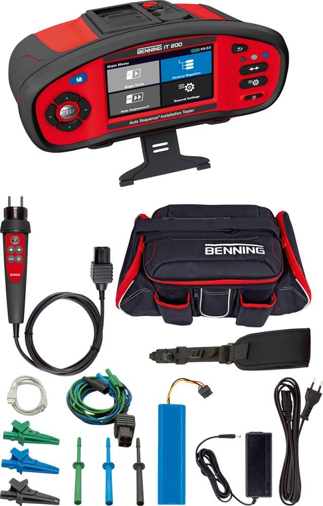Skúšačka inštalácie IT 200 Vyhotovenie: Kryt z plastu s odolnosťou proti nárazu, grafický displej s podsvietením. Použitie: Na bezpečnostno-technické testy elektrických zariadení v súlade s DIN VDE 0100-600 a DIN VDE 0105-100. Dodávka: Skúšačka, testovací kábel s vidlicou s chráneným kontaktom, 3 testovacie hroty, 3 krokosvorky a kalibračný certifikát. IT 200. Pre efektívne testovanie a dokumentáciu elektrických zariadení a nabíjacích staníc pre elektromobily (wallboxov) v režime nabíjania 3. Testovanie rôznych typov RCD, obecných, selektívnych, AC, A, F, B, B+, EV RCD, EV RCM (RDC-DD), MI RCD a PRCD. Test RCD s meraním RCD Auto, RCD t, RCD I a Uc. Meranie napätia a frekvencie TRMS, testovanie rotačného poľa a varistorov. Jednotlivé skúšky a prednastavené merania Auto Sequence® pre TN/TT siete a dobíjacie stanice pre elektromobily (wallboxy). Izolačný odpor so skúšobným napätím. Impedancia slučky (LOOP) a vedenia (LINE) s testovacím prúdom 20 A vrátane výpočtu skratového prúdu/úbytku napätia pre presné výsledky merania. Dodáva sa tiež s trojvodičovým meracím káblom o dĺžke 1,5 m, softvérom pre PC, káblom USB, káblom RS232, SD kartou 8 GB, zástrčkou Commander (vrátane batérií), sadou meracieho hrotu a krokosvorky, popruhom na prenášanie (prístroja), nabíjačkou s li-ion batériou 4400 mAh, kalibračným certifikátom a polstrovanou taškou. Výrobca: Benning Elektrotechnik u. Elektronik GmbH & Co.KG, Münsterstr. 135-137, 46397 Bocholt, DE, +492871930, info@benning.de