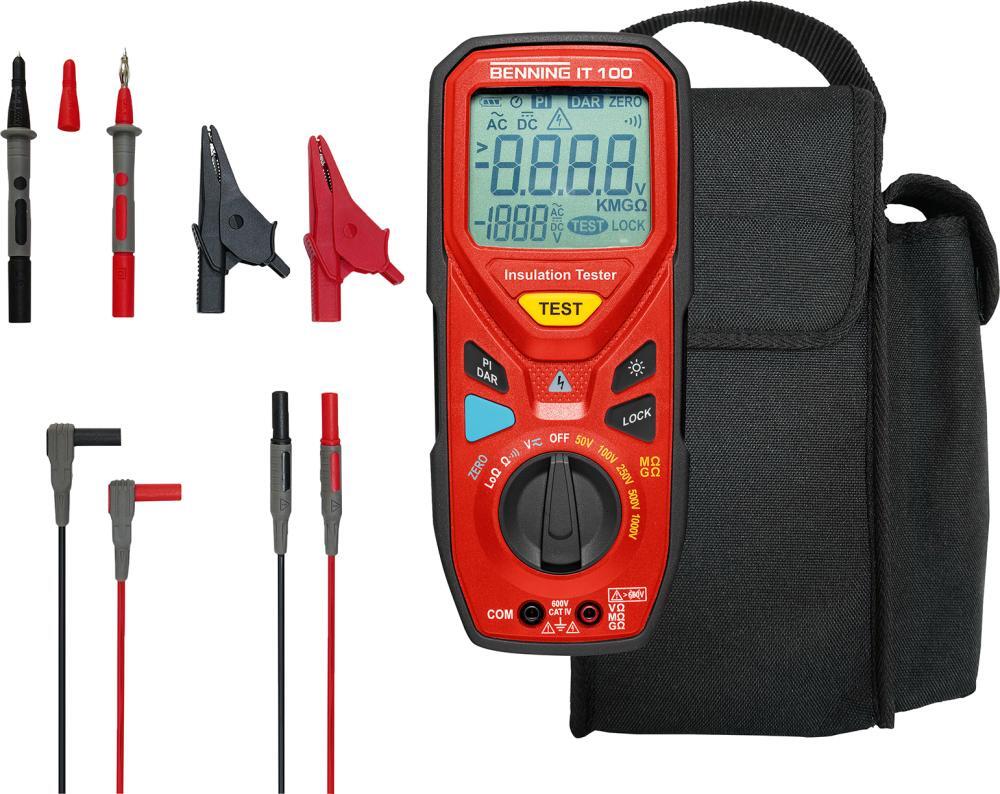 Merač izolačného odporu IT 100 Vyhotovenie: Kryt z plastu s odolnosťou proti nárazu. Meranie odporu skúšobným prúdom 200 mA pre testovanie spojenia ochranných vodičov (VDE 0413-4) s nastavením nuly na meracom vodiči. Meranie izolačného odporu so skúšobným napätím 50 V-1000 V (VDE 0413-2). Samostatné zamedzenie testu v prípade protinapätia. Stanovenie indexu polarizácie (PI) a stupňa dielektrickej absorpcie (DAR). S testovacou funkciou pre kontrolu vnútorného poistky. Dodáva sa vrátane sady meracích hrotov, meracích vodičov, krokosvorek, gumového ochranného rámu, tašky a batérií. Výrobca: Benning Elektrotechnik u. Elektronik GmbH & Co.KG, Münsterstr. 135-137, 46397 Bocholt, DE, +492871930, info@benning.de