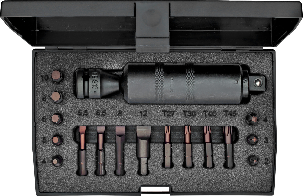 - Zoznam dielov (text): bity 5/16" štvorcový č. 880 5,5 6,5 8 12> bity 5/16" hexagonálne č. 885 4 5 6 8 10> bity 5/16" krížový PH č. 890 2 3 4 bity 5/16" vnútorný TX č. 887 TX T27 T30 T40 T45 spojka koncoviek bitov 5/16" č. KB 819 nástroj na vykrúcanie skrutiek 1/2" č. K 1900
