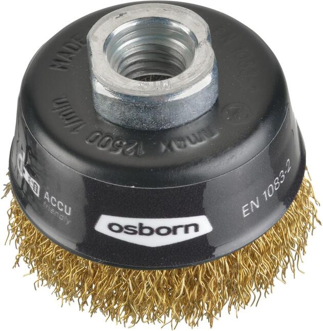 Hrncový kartáč, mosadzný drôt, vlnitý Provedenie: So závitom M14 x 2. Použitie: K upnutiu do všetkých bežných jednoručných uhlových brúsok, špeciálne vyvinutý pre upnutie na akumulátorové uhlové brúsky. K použitiu pri ľahkých až stredne ťažkých čistiacich prácach a opracovaní veľkých plôch. Pre zdrsnenie a matovanie, ako aj odstránenie farby, laku, otřepov, hrdze, okují atď. Výrobca: Osborn GmbH, Ringstraße10, 35099 Burgwald, DE, +4964515880, smandel@osborn.de