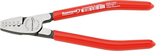 Lisovacie kliešte na koncové dutinky, trapézový profil Vyhotovenie: Z špeciálnej nástrojovej ocele, kalené a popúšťané v oleji. Hlava leštená. Rukoväte s plastovými návlekmi. Použitie: K spoľahlivému zalisovaniu (trapézový profil) káblových koncoviek DIN 46228 (časť 1 + 4), s plastovým límcom. Výrobca: Einkaufsbüro Deutscher Eisenhändler GmbH, EDE Platz 1, 42389 Wuppertal, DE, +4920260960, webkontakt@ede.de