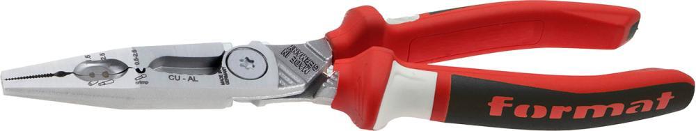 Elektroinštalačné kliešte Prevedenie: Z špeciálnej nástrojovej ocele. Úchopové plochy ozubené s ostrím. Bezpečné uchytenie vďaka agresívnemu drážkovaniu hrotu a štvorkolíkovému uchyteniu v evolventnom otvore horáka. So silovým kĺbom až 30% úspora sily. Použitie: Univerzálne v rámci elektroinštalácií s 6 funkciami: ohýbanie, odhrotovanie, prestrihovanie káblov, odizolovanie, zalisovanie koncových dutiniek (trapézové zalisovanie), ako aj na uchopenie plochého a guľatého materiálu. Hlava leštená, rukoväte s viacsložkovými plastovými návlekmi. Výrobca: Einkaufsbüro Deutscher Eisenhändler GmbH, EDE Platz 1, 42389 Wuppertal, DE, +4920260960, webkontakt@ede.de