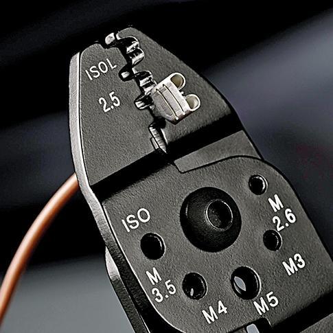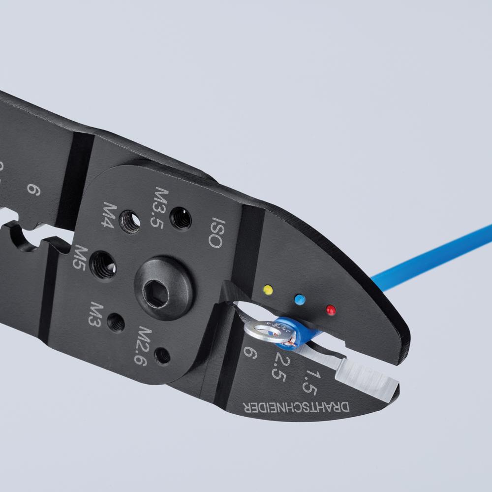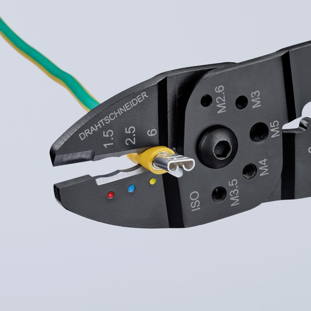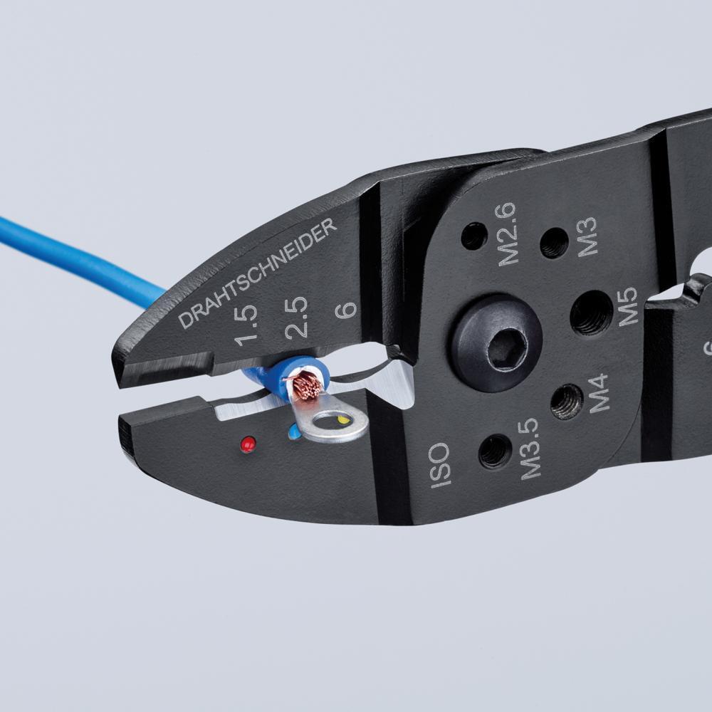 Krimpovacie kliešte Provedenie: Rukoväte s viacosložkovými plastovými návlekmi. Zavedenie zo strany. Použitie: Na rezanie káblov, odizolovanie a krimpovanie. S funkciou zarovnania závitových kolíkov o veľkosti M2,6 až M5. Zo špeciálnej ocele, lakované na čierno. Na odizolovanie káblov 0,75-6 mm². a na zalisovanie izolovaných a neizolovaných káblových očiek a káblových konektorov 0,5-6 mm². Výrobca: KNIPEX-Werk C. Gustav Putsch KG, Oberkamper Str. 13, 42349 Wuppertal, DE, +4920247940, info@knipex.de