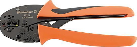 Krimpovacie pákové kliešte CTI 6 G Provedenie: Telo klieští z ocele, s dorazom k presnému umiestneniu kontaktov. Vynútená blokácia zaručuje kvalitné zalisovanie. Možnosti odblokovania v prípade nesprávneho ovládania, s certifikáciou podľa ČSN EN 60352 T.1 (zalisovanie bez tlakových plynov). Rukoväte s plastovými návlekmi. Zavedenie zo strany. So tromi krimpovacími zónami. Použitie: K zalisovaniu prvkov s PVC a polyamidovou izoláciou (kabelových ok, kolíkových kabelových spojok, paralelných a sériových koncoviek, ako aj zásuvných koncoviek). Výrobca: Weidmüller GmbH & Co KG, Klingenbergstraße 26, 32758 Detmold, DE, +49 5231 1428 0, weidmueller@weidmueller.de