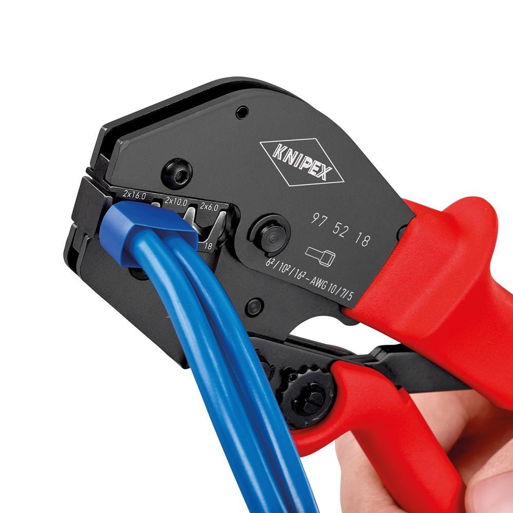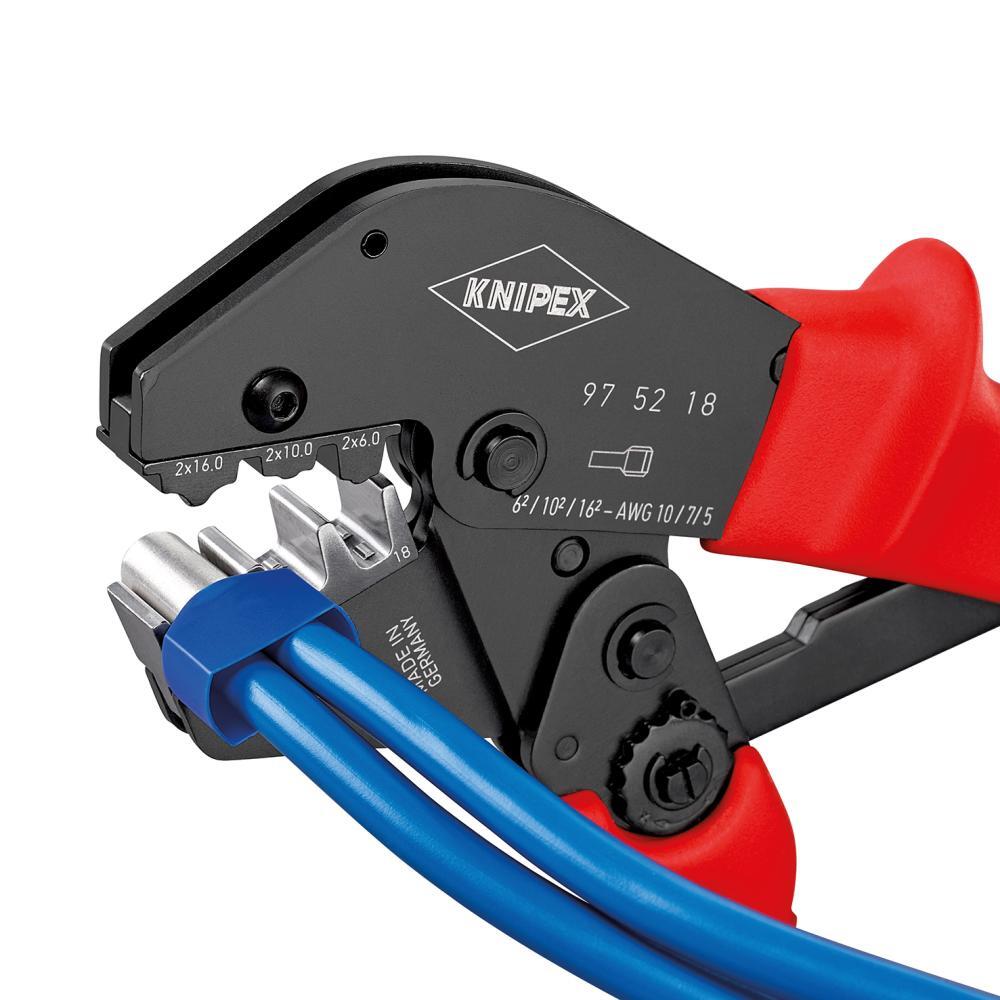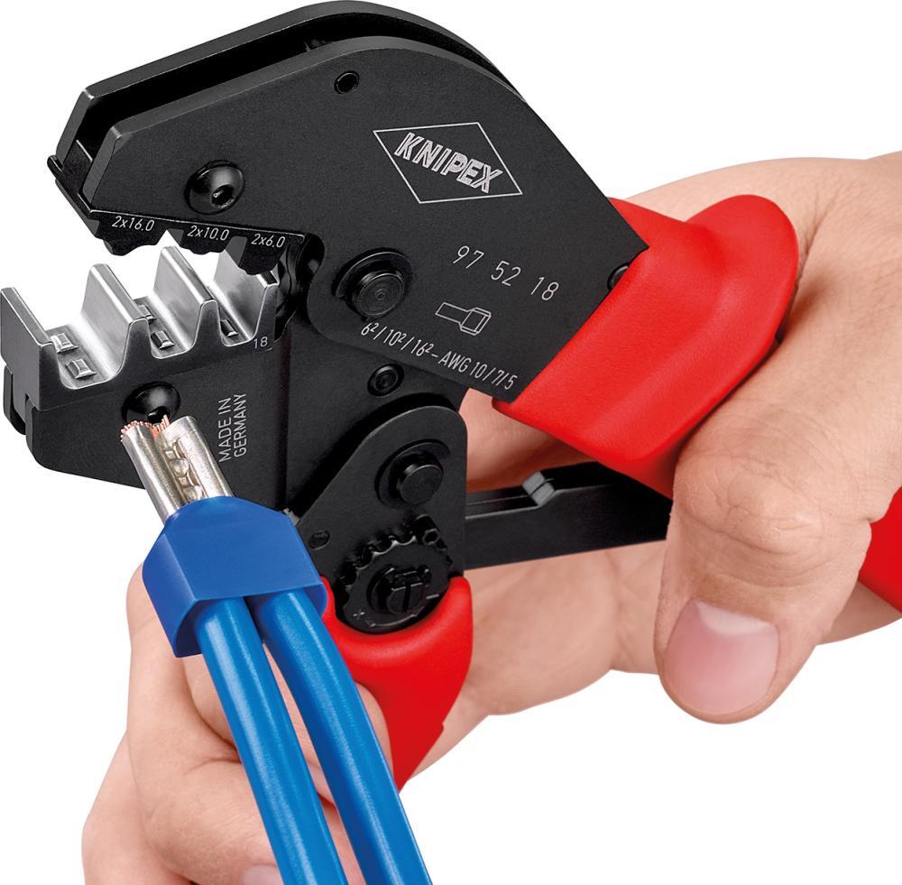 Krimpovacie kliešte pre dvojité káblové koncovky Vyhotovenie: Z chrómvanádiovej elektrooceli so špeciálnym zušľachtením, v oleji kalené a popúšťané. Hlava brunovaná. Pre optimálne výsledky krimpovania vďaka precíznym profilom a odblokovateľnej vynútenej blokácii, krimpovací prítlak je precízne nastavený vo výrobe, zníženie požadovanej ručnej sily až o 30 % vďaka optimálnemu pákovému prevodu. Obouručné vyhotovenie pre jednoduché lisovanie vodičov s veľkým prierezom. Rukoväte s plastovými návlekmi. Zavedenie zo strany. So tromi krimpovacími zónami. Použitie: Na zalisovanie (W zalisovanie) dvojitých káblových koncoviek, s plastovým límcom. Výrobca: KNIPEX-Werk C. Gustav Putsch KG, Oberkamper Str. 13, 42349 Wuppertal, DE, +4920247940, info@knipex.de