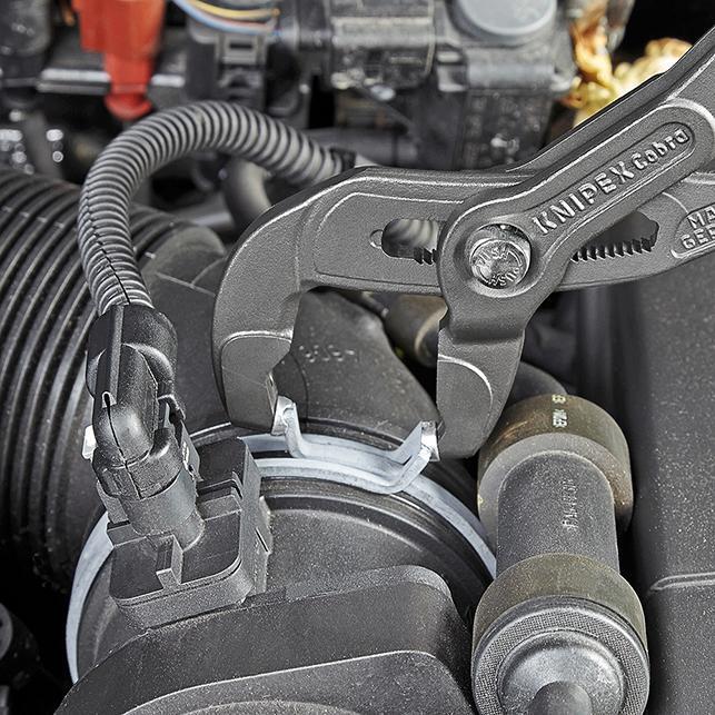 Kliešte na pružinové pásy/spony Provedenie: Kované z chrómovanej vanádiovej elektrooceli, kalené v oleji. Rukoväte s plastovými návlekmi, tlmiace preklz. Otočné, univerzálne uchopovacie vložky pre bezpečné uchytenie spon v každej polohe. Pre štandardné, priestorovo úsporné a drôtené spony, ako aj krúžky, pružinové pásové krúžky do menovitej veľkosti od 50 mm do 70 mm. Výrobca: KNIPEX-Werk C. Gustav Putsch KG, Oberkamper Str. 13, 42349 Wuppertal, DE, +4920247940, info@knipex.de