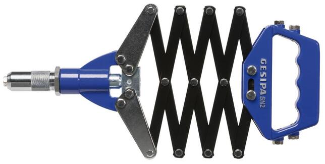 Štíhly nýtovací nástroj SN 2 Vyhotovenie: Z kvalitného hliníkového tlakového odlitku, vybavený uzavretým krytom. Vďaka výhodnému umiestneniu páky so 4 brúsnymi telieskami sa výrazne znižuje potrebná ručná sila. Dodáva sa v plastovom kufríku. Použitie: Pre trhacie nýty s Ø 3 až 6,4 mm Ø všetkých materiálov, okrem trhacích nýtov G-Bulb do Ø 4,8 mm. Rozsah dodávky: Štíhly nýtovací nástroj SN 2, 5 špičiek 17/24, 17/29, 17/32, 17/40, 17/45. Priradenie špičiek: Ø nýtu; materiál nýtu; špička 3 a 3,2; hliník, meď, oceľ, nerez, Stinox, hliník, PG hliník, PG oceľ; 17/24 4; hliník, meď; 17/24 4; oceľ, CAP hliník, CAP meď, hliník, PG hliník; 17/27 4; nerez, Stinox, PG oceľ; 17/29 4,8; CAP hliník, CAP meď; 17/29 5 a 4,8; hliník, PG hliník; 17/29 5 a 4,8; oceľ, hliník; 17/32 5 a 4,8; nerez, Stinox, PG oceľ; 17/36 6; hliník; 17/36 6; oceľ; 17/40 6,4; hliník, PG hliník; 17/40 6,4; oceľ, hliník; 17/45 Výrobca: GESIPA Blindniettechnik GmbH, Nordendstr. 13-39, 64546 Mörfelden-Walldorf, DE, +49 6105 962-0, info@gesipa.com
