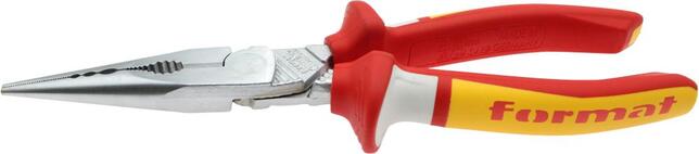 VDE úzke dlhé kliešte, hlava pochromovaná, polokulaté rovné čeľuste Provedenie: DIN ISO 5745. V oleji kalené a popúšťané. Hlava pochromovaná, s polokulatými rovnými čeľusťami, ozubené úchopové plochy, břity dodatočne induktívne tvrdené (61 HRC). Izolácia do 1000 V, podľa ČSN IEC 60900, ČSN EN 60900, VDE 0682/časť 201. Použitie: V oblasti jemnej mechaniky na uchopenie, ohýbanie a rezacie práce. Špeciálna nástrojová oceľ. Čeľuste so tromi drážkami a otvorom na horák k vytahovaniu guľatého materiálu a uchopovaniu a držaniu citlivých obrobkov. Rukoväte s vícesložkovými plastovými návlekmi. Výrobca: Einkaufsbüro Deutscher Eisenhändler GmbH, EDE Platz 1, 42389 Wuppertal, DE, +4920260960, webkontakt@ede.de