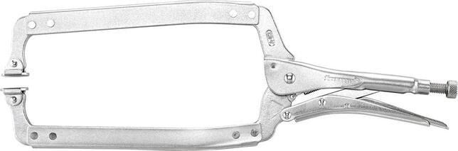Samosvorné kliešte s pozdĺžne posuvnými čeľusťami Provedenie: Telo klieští z chrómvanádiovej ocele, poniklované do lesku. S upínacími čeľusťami v tvare C. Nastavenie rozvoru kľúča a upínacieho tlaku prebieha pomocou regulačného skrutky a rýchloupínacej páčky. Použitie: K upnutiu obrobkov o veľkých rozmeroch, napr. uhlov a profilov. S pohyblivými čeľusťami. Výrobca: Einkaufsbüro Deutscher Eisenhändler GmbH, EDE Platz 1, 42389 Wuppertal, DE, +4920260960, webkontakt@ede.de