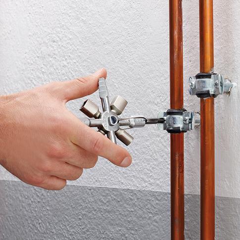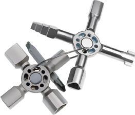 Kľúč k rozvádzačom TwinKey® Vyhotovenie: Zinková tlaková zliatina. Tvorí dva kríže, medzi sebou spojené magnetom. Otočný bit rovná drážka 1 x 7mm/križová drážka PH 2 a drôtené lanko z ušľachtilej ocele. Kľúč so stupňovým vnútorným šesťhranom 6–7–8–9 mm, so stupňovým vonkajším šesťhranom 6–7 mm; 8–9 mm a 10–11 mm, stupňovým vonkajším trojhranom 7–8 mm; 9–10 mm a 11–12 mm, dvojprofilový kľúč 3–5 mm, oblúkový kľúč 6 mm, ako aj šesťhranný kľúč na ventil vykurovacích telies 5 mm. Výrobca: KNIPEX-Werk C. Gustav Putsch KG, Oberkamper Str. 13, 42349 Wuppertal, DE, +4920247940, info@knipex.de