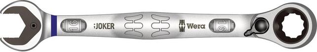 Vidlicový kľúč s očkovou ráčnou Joker č. 6001, prepínateľný Provedenie: Z chrómovej molybdénovej ocele s nikl-chrómovou úpravou, rovný tvar. Jemne ozubený ráčnový mechanizmus s 80 zubami a nastavovacím uhlom 4,5° na očkovej strane. Ráčnová hlava je zahnutá pod 15°. Rovná vidlica v obojstrannom šesťhrannom profile a nastavením uhla iba 30° umožňuje rýchlu prácu aj v obmedzených priestoroch. Vymeniteľná tvrdená a ozubená kovová doska na čeľusti, ktorá slúži ako koncový doraz, držiak a ako poistka proti sklzu, uľahčuje ovládanie nástroja a znižuje nebezpečenstvo preklzu a odklzu. Výrobca: Wera Werkzeuge GmbH, Korzerter Str. 21-25, 42349 Wuppertal, DE, +4920240450, sales@wera.de