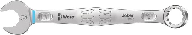 Očkový vidlicový kľúč Joker č. 6003 Provedenie: Strana s očkom ohnutá o 15°. Vidlica kľúča zalomená pod uhlom 7,5° v spojení so špeciálnym dvojitým šesťhranným profilom umožňuje nastavovací uhol 15°, keď sa kľúč obracia medzi jednotlivými krokmi skrutkovania. Použitie: Špeciálne pre použitie vo veľmi stiesnených podmienkach. Výrobca: Wera Werkzeuge GmbH, Korzerter Str. 21-25, 42349 Wuppertal, DE, +4920240450, sales@wera.de