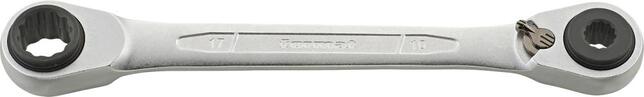 Ráčnový očkový kľúč Quadro Provedenie: Z chrómovo-vanádiovej ocele, s pochromovaním. Presný ozubený ráčnový mechanizmus so 72 zubami a nastavovacím uhlom iba 5°. Kľúče sú vybavené 4 otvormi v jednom kľúči. Utahovacie momenty predčia hodnoty stanovené podľa normy DIN 3110, ISO 3318. Výrobca: Einkaufsbüro Deutscher Eisenhändler GmbH, EDE Platz 1, 42389 Wuppertal, DE, +4920260960, webkontakt@ede.de