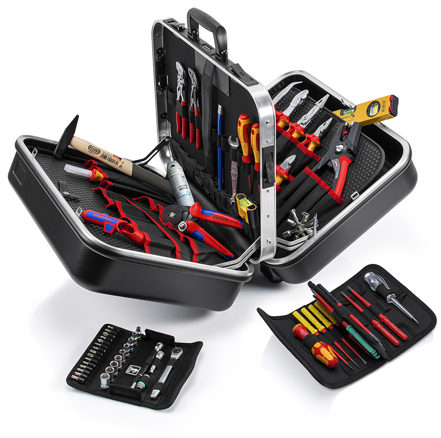 00 21 42 Kufor na náradie "VEĽKÝ dvojitý" Elektrikársky Vybavené 14 kusmi KNIPEX náradia, celkovo 63 kusov značkového náradia, niektoré VDE testované podľa DIN EN 60900. S celkovo 95 možnosťami vloženia. Max. užitočné zaťaženie: 25 kg. Objem: 38 litrov. Voľne stojace vo všetkých otváracích polohách vďaka zacvakávacím držiakom veka so závesným mechanizmom na oboch stranách, uhol voľne nastaviteľný. Možno otvoriť z jednej alebo oboch strán; dno a veko možno otvoriť nezávisle od seba. Pole etikety s dvomi nálepkami pre individuálne označenie. Vysokozaťažiteľný ABS materiál, čierny. Obvodový hliníkový rám s bezpečne namontovanou, pevnou strednou stenou, ktorá môže byť vybavená náradím z oboch strán, s rôznymi možnosťami výbavy vďaka elastickým slučkám a dvanástim malým vreckám. Kovové závesy. Trojčíslicový kombinačný zámok pre bezpečné uzamknutie kufra. 2 sklopné zámky k uzamknutiu veka a vaničky. Vyberateľná priehradka na dokumenty a vyberateľná doska na náradie vyrobená zo špinu odpudzujúcich dvojstenných PP dosiek s 13 vreckami na náradie. Spodné veko, môže byť zopnuté, výška 58 mm, môže byť rozdelené flexibilnými vložkami; krycia doska so šiestimi veľkými priehradkami. - Rozmer vonkajší (vnútorný) šírka mm: 520mm 490mm - Rozmer vonkajší (vnútorný) výška mm: 435mm 370mm - Rozmer vonkajší (vnútorný) hĺbka mm: 290mm 110mm Obsah: 1 x 00 11 01 Knipex TwinKey® Kľúč na rozvodnú skriňu pre všetky štandardné skrinky a vypínacie systémy (92 mm), 1 x 86 03 180 KNIPEX Kliešťové kľúče Kliešte a kľúč v jednom náradí (180 mm), 1 x 98 52 KNIPEX Nôž na káble (190 mm), 1 x 97 53 04 KNIPEX Automatické lisovacie kliešte pre dutinky s bočným prístupom (0,08 – 10 + 16 mm²), 1 x 08 26 145 KNIPEX Kombinované kliešte s ihlovým nosom (145 mm), 1 x 87 01 180 Knipex Cobra® Hightech kliešte na vodné čerpadlá (180 mm), 1 x 98 25 01 SL KNIPEX Skrutkovač (štíhly) pre skrutky s krížovou drážkou Pozidriv® (PZ1 x 80 mm), 1 x 98 20 35 SL KNIPEX Skrutkovač (štíhly) pre drážkované skrutky (0,6 x 3,5 x 100 mm), 1 x 13 86 200 KNIPEX Kliešte pre elektroinštalácie (Ø 15 mm / 50 mm²), 1 x 16 95 01 SB KNIPEX ErgoStrip® Univerzálny odizolovací nástroj (Ø 8,0 – 13,0 mm), 1 x 70 06 160 Knipex Bočné cvikacie kliešte (160 mm), 1 x 26 26 200 Knipex Polguľaté bočné cvikacie kliešte (Kliešte v tvare bocianieho zobáka) (200 mm), 1 x 5003484001 Wera 16-dielna sada VDE vymeniteľných nástavcov, tenkých, 1 x 004018 Wera 8100 SA 8 Zyklop sada kovových rační 28 dielov (1/4"), 1 x 003760 Wera Joker vidlicový kľúč (10 x 13 mm), 1 x 101-0300 Picard Zámočnícke kladivo (300 g), 1 x 9R 212 00096 Rennsteig , 1 x 361 252 1 Rennsteig Elektrikársky sekáč (250 x 10 mm), 1 x 16135 Stabila Vodováha typ 70 Electric (430 mm), 1 x 18115 Stabila Mini vodováha Pocket Electric (68 mm), 1 x 12 52 195 SB KNIPEX PreciStrip16® Automatický odizolovací nástroj (0,08 - 16 mm²), 1 x 74 06 200 Knipex Bočné cvikacie kliešte s veľkou pákovou silou (200 mm),