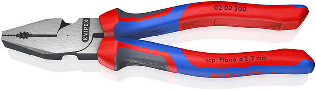 02 02 200 SB Kombinované kliešte s veľkou pákovou silou 35 % menej námahy než je potrebné u bežných kombinovaných klieští. s reznými hranami (tvrdosť cca 63 HRC) pre ťažké podmienky. ľahšia práca vďaka optimalizovanej pákovej sile. ľahšie rezanie, silné uchopenie, ohýbanie a ťahanie. Dlhé rezné hrany pre hrubšie káble. S úchopovými zónami pre plochý a okrúhly materiál, vhodné pre rôznorodé použitie. . Rezné hrany dodatočne indukčne kalené; tvrdosť reznej hrany pribl. 63 HRC. S pohodlnými rukoväťami: pozostáva z troch ergonomických komponentov na optimalizovanú manipuláciu a disponuje dvoma rozhraniami KNIPEXtend pre nadstavce. - Kapacity strihania mäkkého drôtu (priemer): Ø 2,8mm - Kapacity strihania pružinového drôtu (priemer): Ø 2,2mm - Kapacita rezania medený kábel, viacprameňový: Ø 13,0mm - Kapacita rezania medený kábel, viacprameňový: 25,0mm²