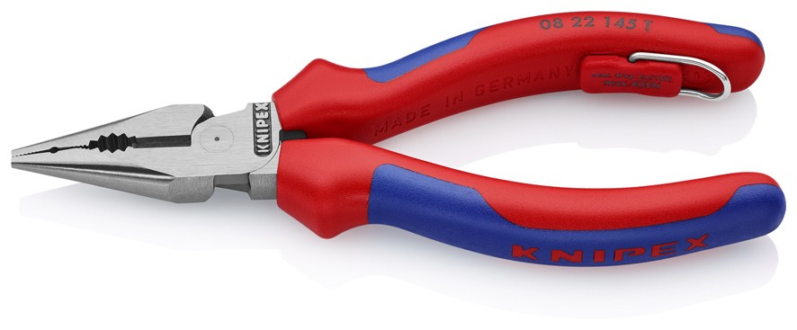 08 22 145 T Kombinované kliešte s ihlovým nosom Pre všetky bežné inštalačné a opravárske práce.. praktické použitie pri práci v stiesnených oblastiach vďaka štíhlemu dizajnu hlavy a špicatým čeľustiam (nepretáčavým). úchopové povrchy so špeciálnou konvexnou kontúrou na jednej strane pre bezpečné uchopenie plochých dielov. frézované drážkovanie v úchopovej oblasti umožňuje držanie a ťahanie malých častí, ako napr. klince, kolíky a skrutky. Spoľahlivé a rôznorodé kombinované kliešte keď ste vonku na cestách. ľahké rezanie vďaka veľkej pákovej sile kĺbu. S reznými hranami pre mäkký, stredne tvrdý a tvrdý drôt. Rezné hrany dodatočne indukčne kalené; tvrdosť reznej hrany pribl. 61 HRC. Dlhá životnosť a stabilné špičky. kliešte so závesným okom na montáž ochrany proti pádu. - Kapacity strihania stredne tvrdého drôtu (priemer): Ø 3,0mm - Kapacity strihania mäkkého drôtu (priemer): Ø 2,0mm - Kapacita rezania medený kábel, viacprameňový: Ø 8,0mm - Kapacita rezania medený kábel, viacprameňový: 16,0mm² - :