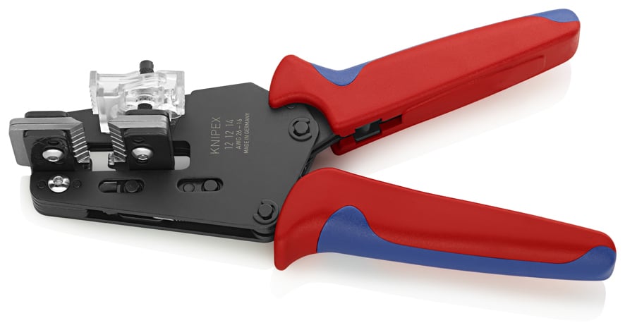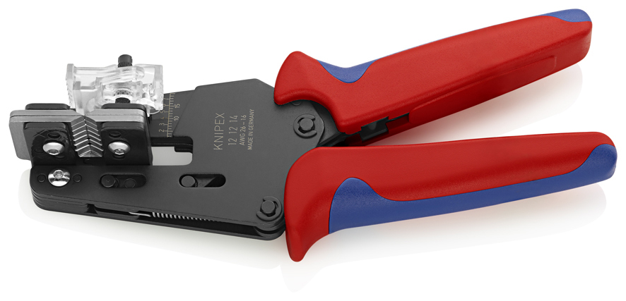 12 12 14 Presný odizolovací nástroj Správne odizolovanie aj pre ťažko odstrániteľné izolačné materiály vyrobené z PTFE, silikónu, Radox®, Kapton® a gumy; tiež viacvrstvové. Druhý pár nožov drží zostávajúcu izoláciu bezpečne na mieste. Vymeniteľná tvarovaná čepeľ sa automaticky prispôsobí príslušnému prierezu vodiča. So zarážkou pre konštantnú dĺžku odizolovania počas opakujúcej sa práce. určené špeciálne pre káble podľa americkej špecifikácie (AWG). Kapton® je registrovaná ochranná známka spoločnosti E. I. du Pont de Nemours and Company. Radox® je registrovaná ochranná známka spoločnosti Huber & Suhner AG. - AWG: 26 / 24 / 22 / 20 / 18 / 16
