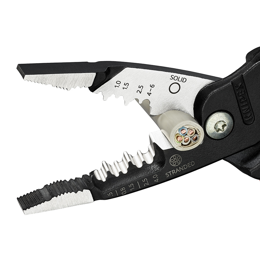 13 71 200 ME SB KNIPEX WireStripper Inteligentné odizolovanie: Veľký rozsah kapacity, ostro brúsené profily na odizolovanie a intuitívne polohovanie.. Inovatívna geometria rezania: Jednoduchšie rezanie, najmä plochých káblov.. Hybridná konštrukcia: Ploché ako kliešte s ihlovým nosom, široké ako kombinované kliešte pre vysokú stabilitu s dobrou dostupnosťou.. Presne vytvarované profily na odizolovanie plných vodičov od 0,75 do 6 mm² a jemne prameňových vodičov od 0,5 do 4 mm².. Presné umiestnenie drôtu vďaka polohovacím mostíkom. Jednoduché rezanie medených a hliníkových káblov až do Ø 15 mm (1/2"). Široké, priečne šrafované úchopové plochy na krútenie drôtov.. Frézovaná drážka na bezpečné držanie a vyťahovanie malých obrobkov, ako sú napríklad klince.. Konvexná úchopová plocha na jednej strane na bezpečné uchopenie plochého materiálu a úchopová plocha na okrúhly materiál.. Vonkajšie hrany na odihlovanie rúr..