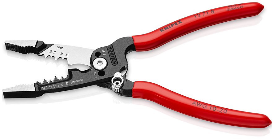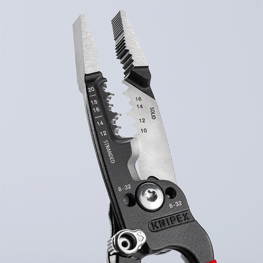 13 71 8 KNIPEX WireStripper Odizolujte rýchlejšie: presné umiestnenie drôtu vďaka polohovacím mostíkom. Inovatívna geometria rezných hrán, mimoriadne výkonné rezné hrany: o 50 % vyššia kapacita rezania a o 25 % menšie úsilie pri rezaní v porovnaní so štandardnými odizolovacími kliešťami. Rýchle rezanie závitových tyčí a skrutiek UNC 6-32 a 8-32 bez otrepov až do triedy 4.6. Presne brúsené: odizolovacie profily pre vodiče od 18 do 10 AWG (pevné) a 20 až 12 AWG (jemné prameňové). Jednoduché rezanie medených a hliníkových káblov až do Ø 15 mm (1/2"). Multifunkčné úchopové povrchy na spoľahlivé uchopenie, držanie a ohýbanie plochého a okrúhleho materiálu, ako aj ohýbanie drôtov. Vysoká stabilita a dobrý prístup vďaka hybridným hrotom na hlave klieští, ktoré sú ploché a široké. Pohodlné: pohodlná šírka otvárania a ergonomický tvar rukoväte, integrovaná otváracia pružina uľahčuje časté strihanie. Ideálne pre pravákov aj ľavákov: blokovací mechanizmus je možné ovládať z oboch strán. Výrazné vonkajšie hrany čeľustí na prácu na podomietkových zásuvkách a vyčistenie priechodových otvorov. - Kapacita rezania medený kábel, viacprameňový: Ø 15mm - Kapacita rezania medený kábel, viacprameňový: 1/2in - Kapacita rezania medený kábel, viacprameňový: 50mm² - AWG: 1 / 0