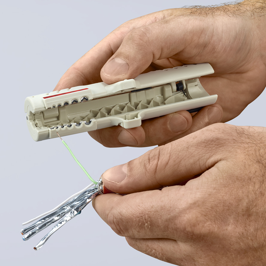 16 65 125 SB Odizolovacie náradie na dátové káble Na odizolovanie UTP a STP dátových káblov s priemermi 4,5 až 10,0 mm. Odizolovacie zariadenie pre prierezy 0,2 / 0,3 / 0,8 / 1,5 / 2,5 / 4 mm². Dvojdielny otvárací nástroj na odizolovanie. S otváracou pružinou a blokovacím mechanizmom. Praktický klip pre jednoduchú prepravu. - : 0,2 — 4mm² - : Ø 4,5 – 10mm - Typ kábla: CAT 5, CAT 6, CAT 7, Twisted Pair (UTP/STP) CAT 5, CAT 6, CAT 7, Twisted Pair (UTP/STP)