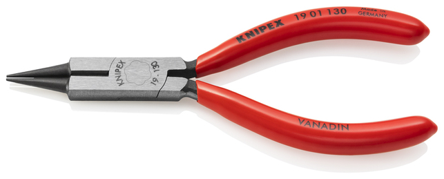 19 01 130 SB Kliešte s guľatými čeľusťami s reznou hranou okrúhle čeľuste s presným výbrusom a s jemnými, špicatými hrotmi. na uchopenie a manipuláciu s jemnými drôtmi, napr. v klenotníctve. Ideálne na rezanie a ohýbanie, aj v elektronike. Na ohýbanie drôtených slučiek. Rezné hrany dodatočne indukčne kalené; tvrdosť reznej hrany pribl. 60 HRC. - Kapacity strihania stredne tvrdého drôtu (priemer): Ø 2,2mm - Kapacity strihania mäkkého drôtu (priemer): Ø 1,6mm - Hrúbka čeľustí (spoj) (T1): 8,0mm - Šírka hrotov (W4): 2,0mm - Hrúbka špičiek (D1): 1,0mm - Dĺžka čeľustí (L3): 32,0mm - Šírka hlavy (W3): 13,5mm