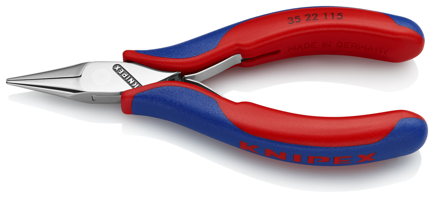 35 22 115 SB kliešte pre elektroniku . Starostlivo zaoblená hlava: žiadne ostré hrany, ktoré by mohli poškodiť materiál. Úzka izolácia rukoväte potiahnutá až k hlave klieští umožňuje bezpečné a pohodlné držanie náradia, tiež medzi palcom a ukazovákom. Rovnomerné správanie pri ohýbaní pre priamejší vnem z práce. Hladko brúsené úchopové plochy na uchopenie bez poškodenia. Dvojitá pružina s nízkym trením pre jemné a rovnomerné roztváranie. Zrkadlové leštenie spolu s jemným olejovým filmom ponúkajú účinnú ochranu proti hrdzi – žiadne skraty spôsobené odlupovaním chrómu z pochrómovaného náradia. Ploché, široké čeľuste, hladko brúsené úchopové plochy. polguľaté čeľuste. - Dĺžka čeľustí (B): 22,5mm - Hrúbka čeľustí (spoj) (D): 6,5mm - Šírka špičiek (E): 2,0mm - Hrúbka špičiek (F): 1,5mm - Šírka hlavy (A): 11,0mm