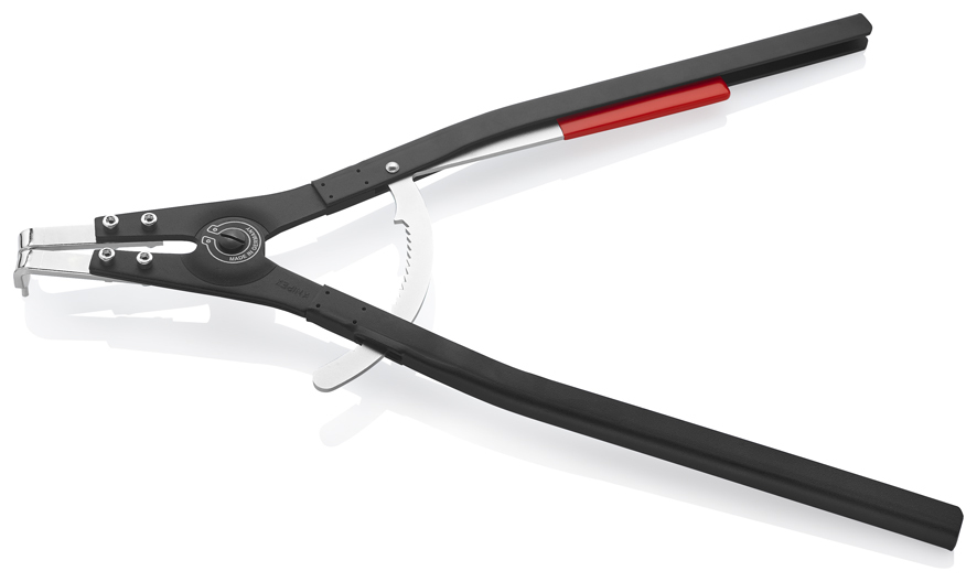 46 20 A61 Kliešte na poistné krúžky S blokovacím mechanizmom, môže byť uvoľnený. S vymeniteľnými špičkami vyrobenými z tvrdenej ocele. čierne popráškované. DIN 5254 B; špičky zahnuté v uhle 90°. - Veľkosť hriadeľa: Ø 252 – 400mm - Hroty (priemer): 4,5mm