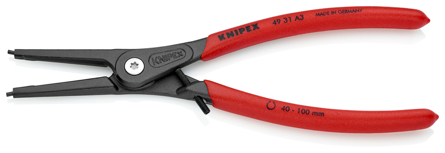 49 31 A3 Presné kliešte na poistné krúžky vysokozaťažiteľné pri nepretržitom používaní: až 10 x dlhšia životnosť v porovnaní so sústruženými špičkami. S vloženými hrotmi pre spoľahlivú prácu. Veľké kontaktné plochy na špičkách: žiadna deformácia poistných krúžkov, jednoduché nasadenie. Skrutkový kĺb: presnosť, žiadna vôla pri práci s kliešťami. Vnútorná otváracia pružina, chránená a skrytá. Protišmykové poplastovanie na rukovätiach. So zaistením proti prepnutiu (nastavenie pomocou dorazu). nastavenie pomocou skrutky so šesťhrannou hlavou. ideálne pre sériovú výrobu, keďže je účinne zabránené nadmernej rozťažnosti krúžkov.