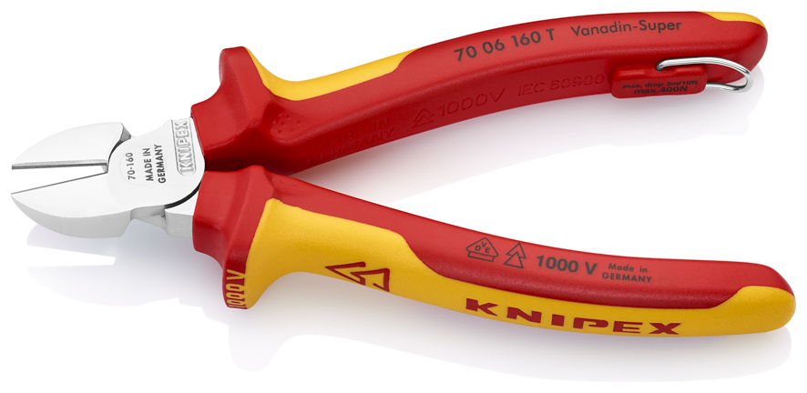 70 06 160 T BK Bočné cvikacie kliešte úzky štýl hlavy pre použitie v stiesnených oblastiach. Nepostrádateľné bočné cvikacie kliešte pre univerzálne použitie. Vysoko kvalitný materiál a presné spracovanie pre dlhú životnosť. Presné rezné hrany pre mäkký a tvrdý drôt. čistý rez tenkých medených drôtov, tiež na špičkách reznej hrany. Rezné hrany dodatočne indukčne kalené; tvrdosť reznej hrany pribl. 61 HRC. s predĺženou reznou hranou. Kliešte s integrovaným, izolovaným závesným okom na pripevnenie zaisťovacieho systému. - Kapacity strihania mäkkého drôtu (priemer): Ø 4,0mm - Kapacity strihania stredne tvrdého drôtu (priemer): Ø 3,0mm - Kapacity strihania mäkkého drôtu (priemer): Ø 2,0mm - : - :