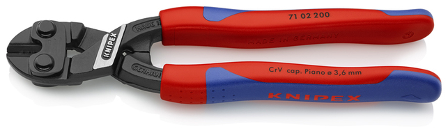 71 02 200 SB KNIPEX CoBolt® S presnými reznými hranami pre mäkký, tvrdý a pružinový drôt. Reže skrutky, klince, nity a pod. do 5,2 mm priem.. Efektívny dizajn kĺbu zaisťuje výnimočný rezný výkon s minimom námahy. Rezné hrany dodatočne indukčne kalené; tvrdosť reznej hrany pribl. 64 HRC. Rezná hrana s mikroštruktúrami obmedzuje skĺznutie materiálu z čeľustí. s úchopovou časťou pod kĺbom na uchopenie a ťahanie drôtov od Ø 1,0 mm. so štíhlymi multi-komponentnými úchopmi bez olemovania pre lepšiu manipuláciu a ľahšiu prepravu. s veľkým kontaktným povrchom na rukovätiach pre lepšie rozdelenie tlaku a väčšie pohodlie pri práci. - Kapacity strihania mäkkého drôtu (priemer): Ø 6mm - Kapacity strihania stredne tvrdého drôtu (priemer): Ø 5,2mm - Kapacity strihania mäkkého drôtu (priemer): Ø 4,0mm - Kapacity strihania pružinového drôtu (priemer): Ø 3,6mm